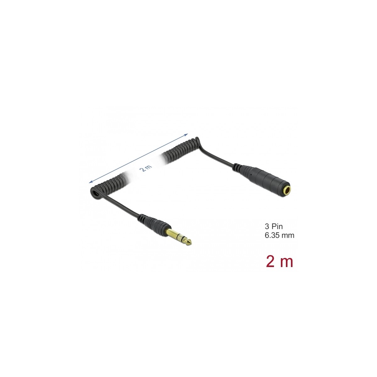 Delock Coiled Cable Extension 3 pin 6.35 mm Stereo Jack male to Stereo Jack female 2 m black