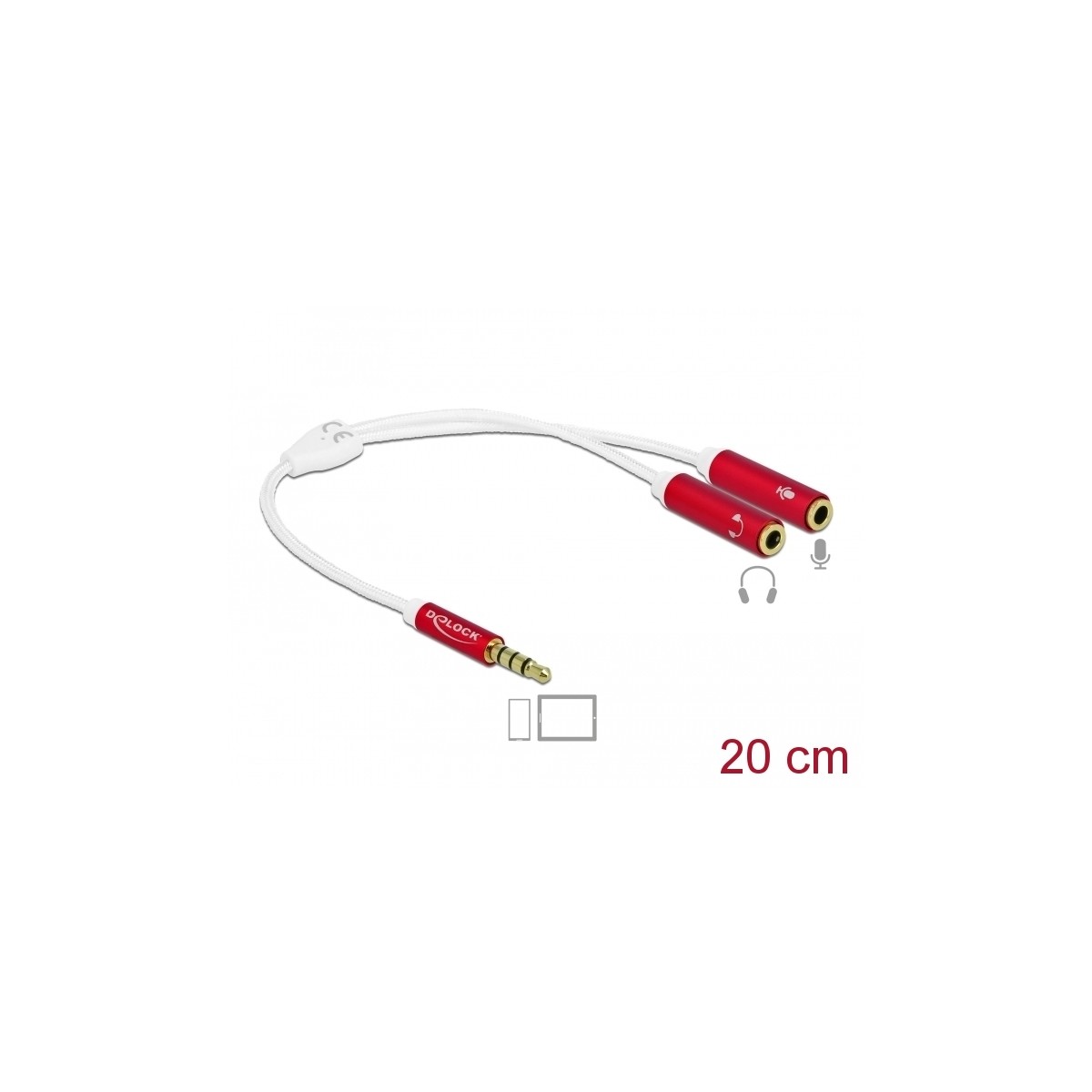This adapter by Delock enables the connection to a common headset with two 3.5 mm stereo jack male connectors with standard 4 pin pin assignment to a smartphone or tablet with 3.5 mm 4 pin stereo jack female port. Just connect the connector of the headset to the respective female ports of the adapter. Optically it convinces with its fine textile shielding and with its gold-plated connector.