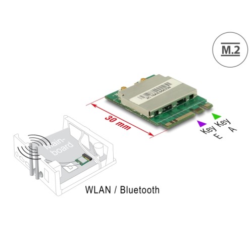 This M.2 module by Delock can be inserted into an M.2 slot with key A or key E. It provides one WLAN interface which exchanges signals via PCIe with the system and one Bluetooth interface which exchanges signals via USB with the system.