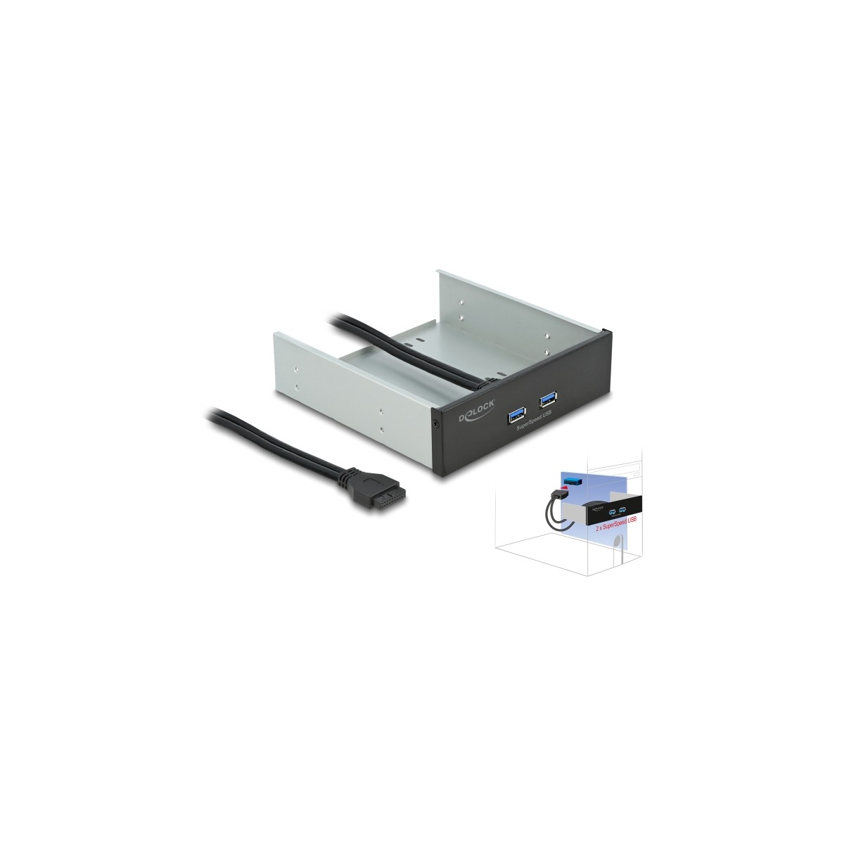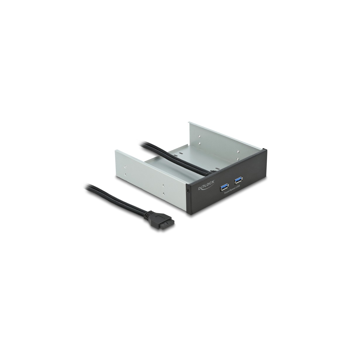 This SuperSpeed USB (USB 3.2 Gen 1) Front Panel by Delock is made for installation into a free 5.25″ bay of a computer and can be connected internally to a free USB 3.0 pin header port.