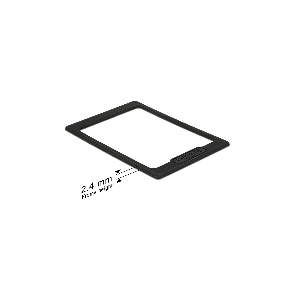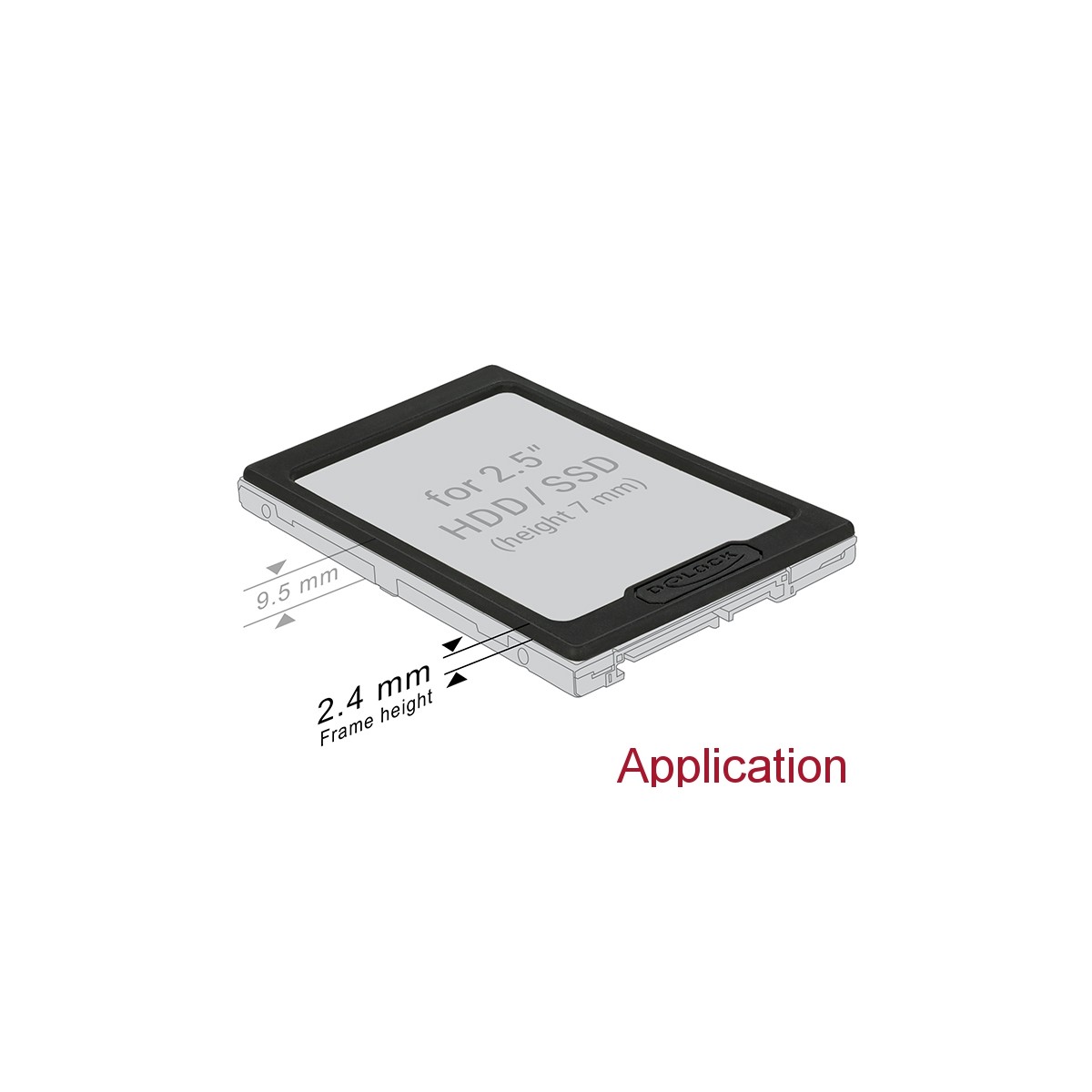 This extension frame by Delock can be sticked onto a HDD / SSD hard drive to adjust the installation height. Therefore the hard disk can be adjusted to a different installation height, so that it can be installed in an external enclosure or a mobile rack, if it is required. The frame can be used together with an SSD that has an installation height of 7 mm. Thus it can be used in mobile racks that require an installation height of 9.5 mm. This ensures that the SSD can be inserted correctly in the mobile rack. Otherwise there can be problems with the mechanism of the mobile rack.