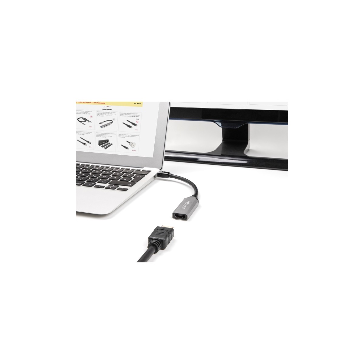 This adapter by Delock enables the connection of an HDMI monitor, projector or TV to the device with a free mini DisplayPort interface. Due to the small dimensions, the adapter is ideal as on the go companion.