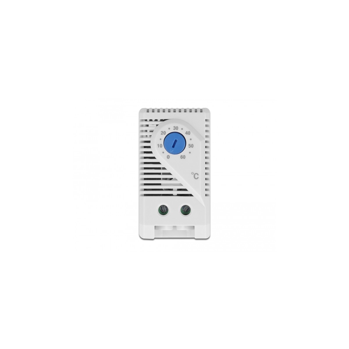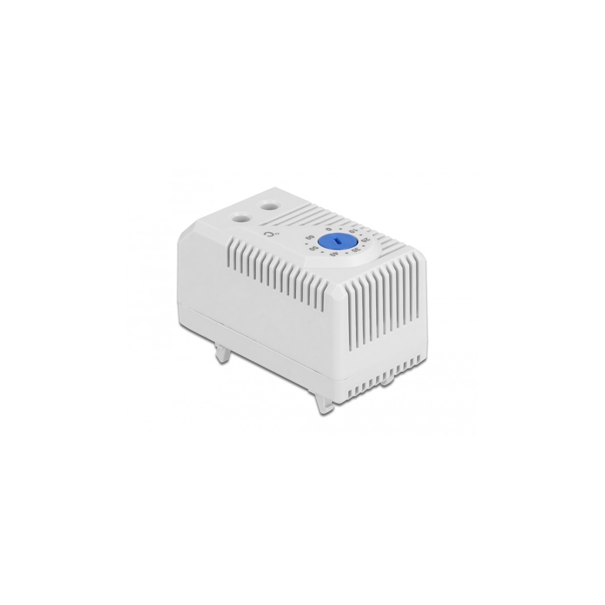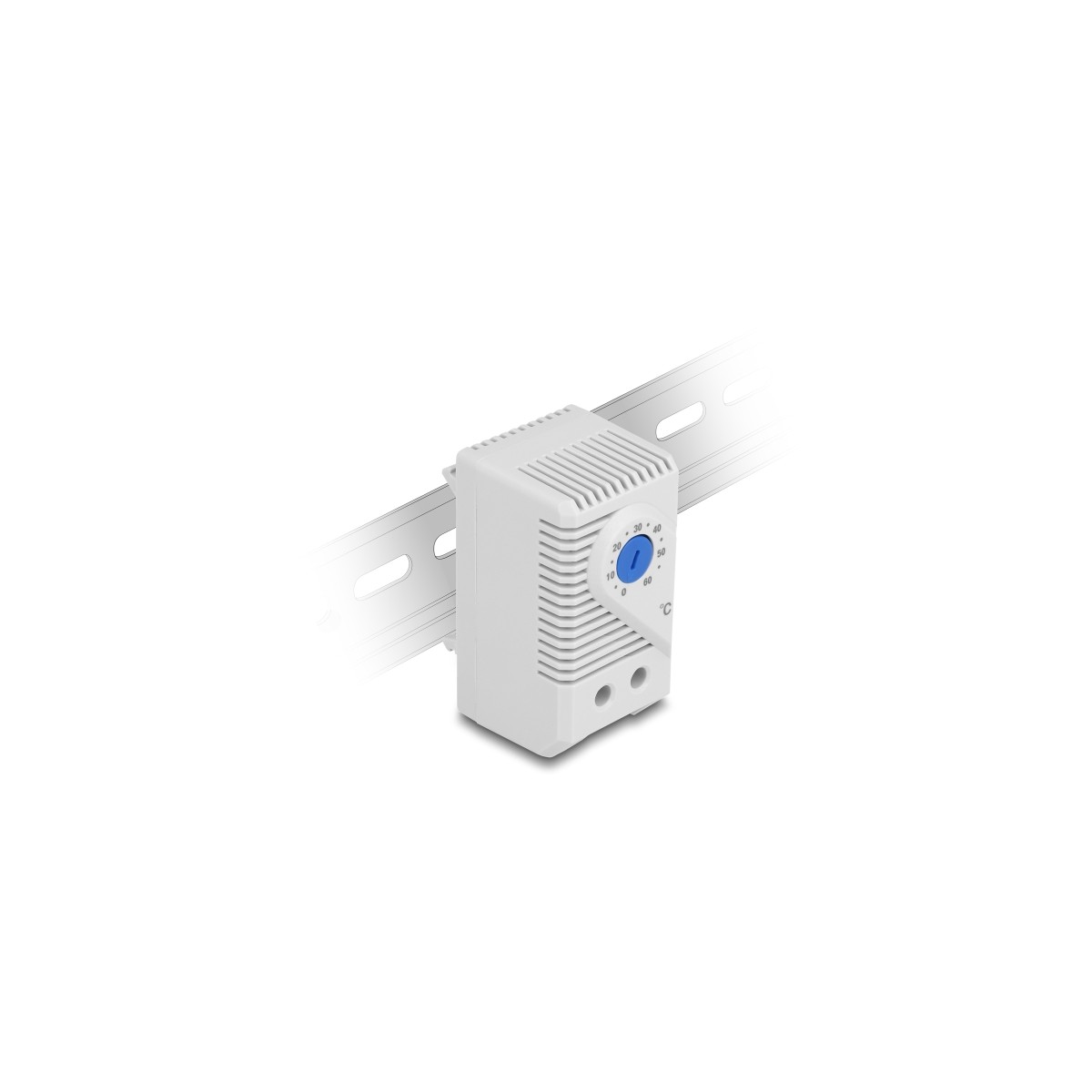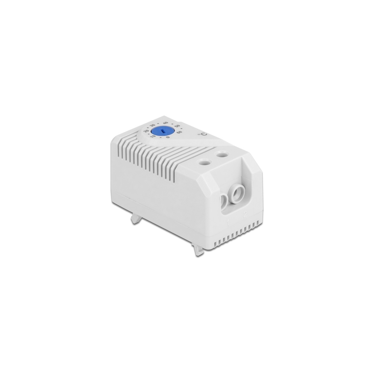 This thermostat by Delock can be used to control filter fans, heat exchangers or to switch signal devices when the temperature is exceeded. The contact closes when the temperature rises. Due to the integrated clips on the back, it can be mounted on a 35 mm DIN rail in a control cabinet.