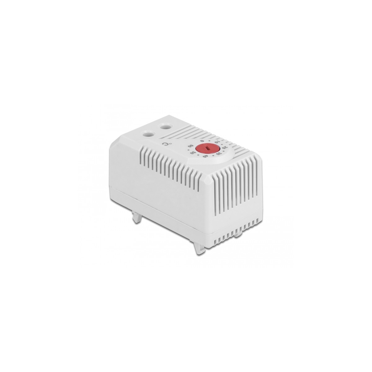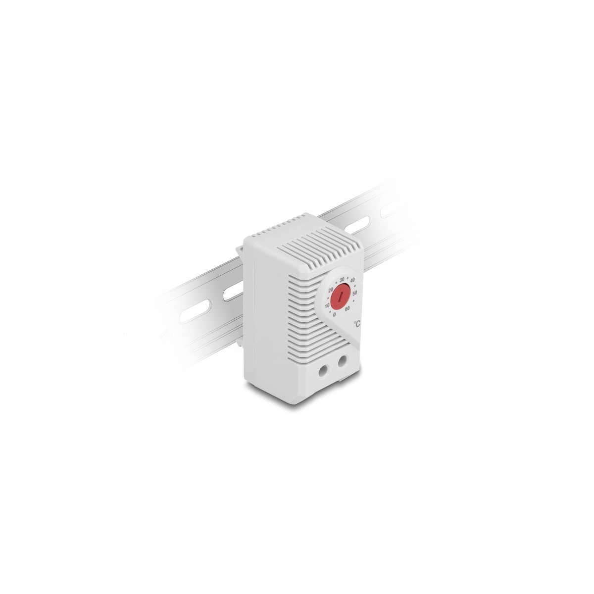 This thermostat by Delock can be used to control heating equipment or to switch signal devices when the temperature is exceeded. The contact opens when the temperature rises. Due to the integrated clips on the back, it can be mounted on a 35 mm DIN rail in a control cabinet.
