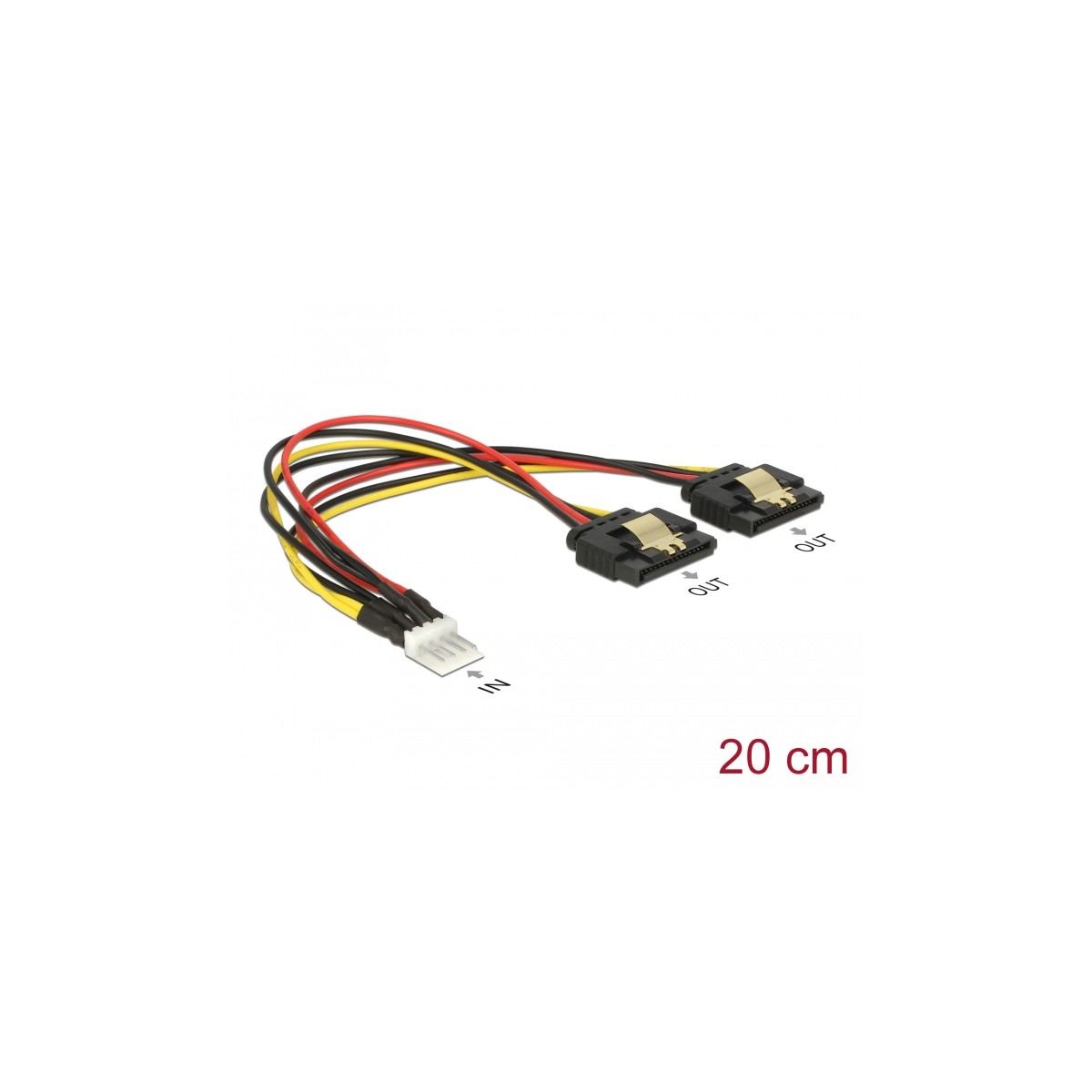 This cable by Delock enables the power supply of two devices equipped with a SATA 15 pin receptacle over one free Floppy 4 pin power connector on the power supply. The metal clips on the SATA receptacles ensure that the cable reliably clicks into place.