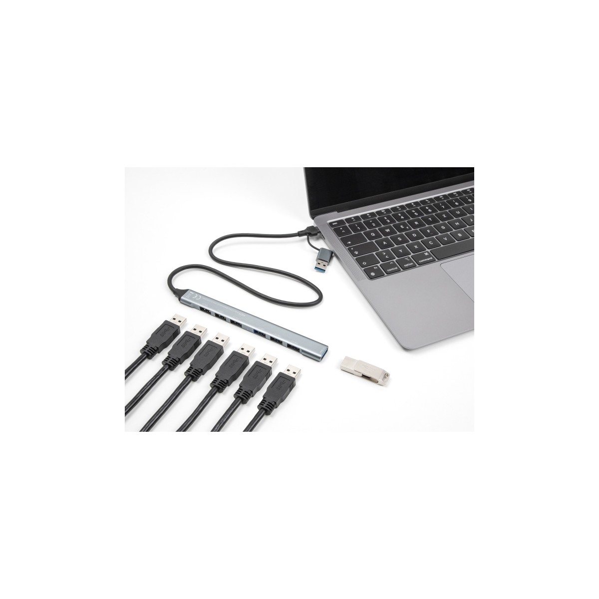 This solid USB hub by Delock with metal housing can be connected to a computer, laptop or mobile device via the USB Type-A or USB-C™ interface. It expands the computer by seven USB ports. Different USB devices such as USB flash memory, card reader, external enclosure etc. can be connected.