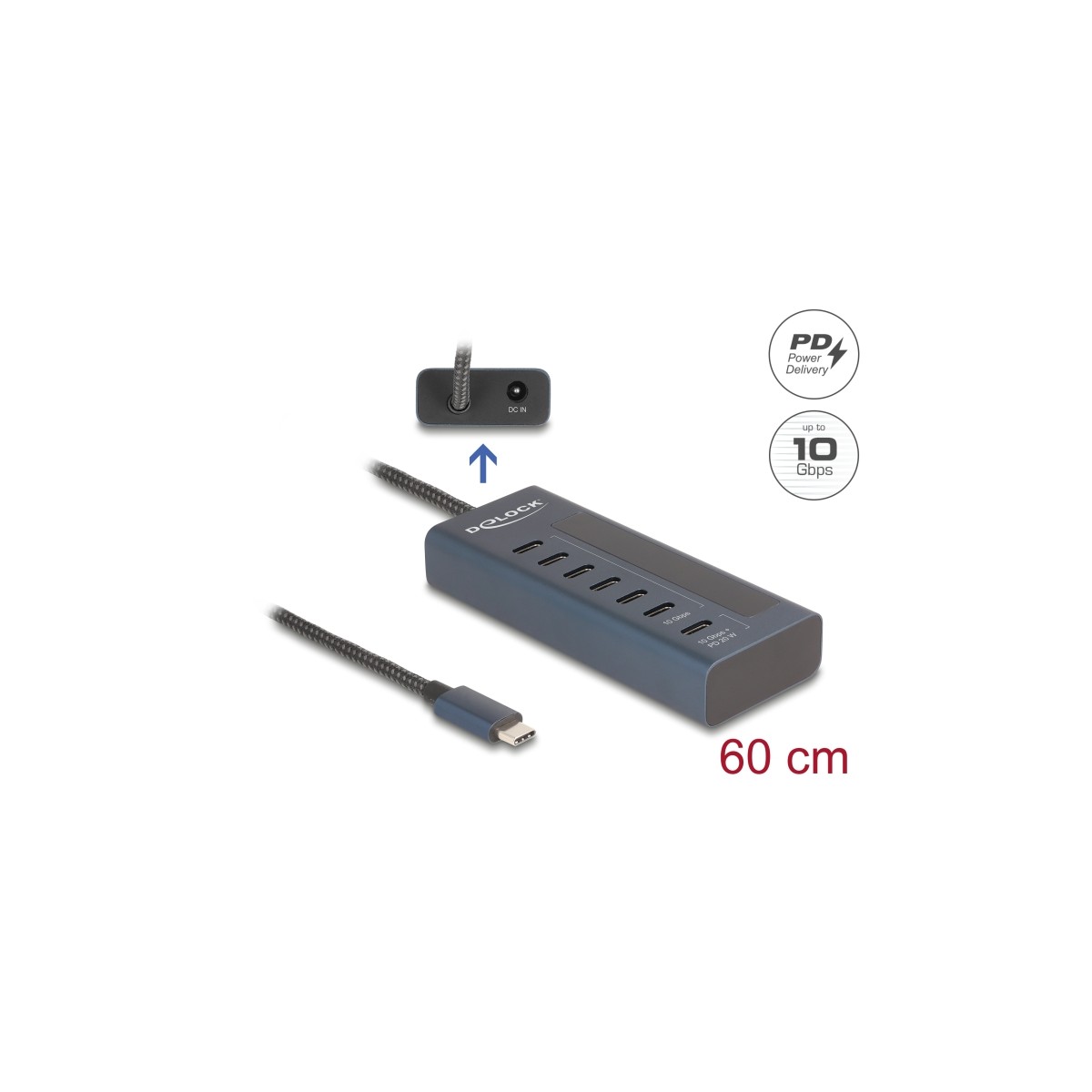 Delock USB 10 Gbps Hub with 7 USB Type-C™ Ports thereof 6 x Data Port + 1 x Data and PD 20 Watt with power indicator