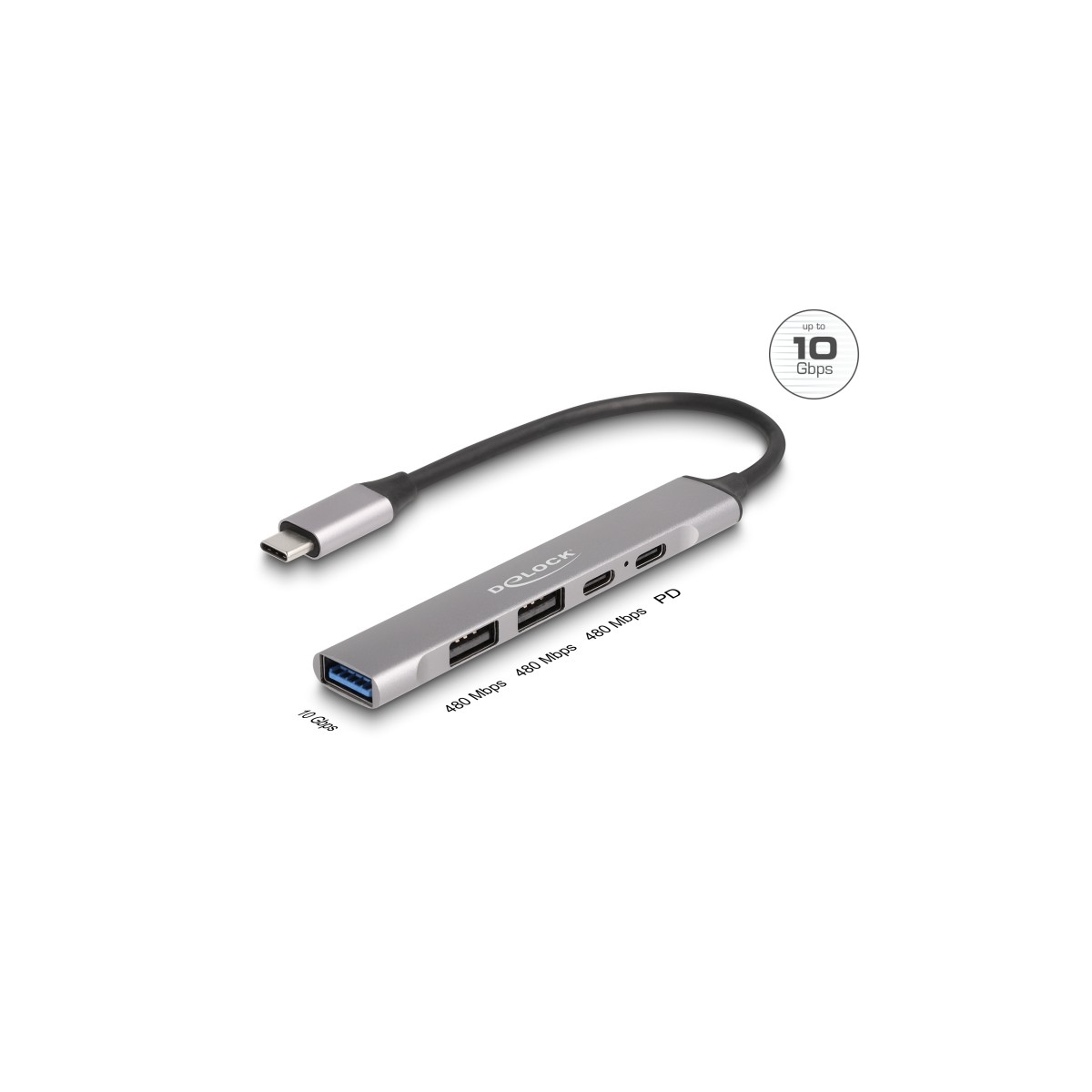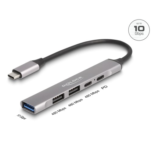 Delock 4 Port Slim USB Type-C™ Hub with 1 x USB 10 Gbps Type-A + 2 x USB 2.0 Type-A + 1 x USB 2.0 USB Type-C™ and PD 95 W