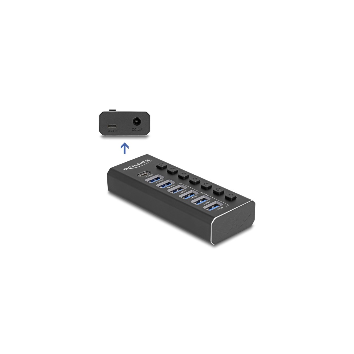 This solid USB hub by Delock with metal housing can be connected to a computer via the USB Type-A or USB-C™ interface. It expands the computer by 4 USB 5 Gbps Type-A female ports with fast charging function (5 V / 2.4 A) and 2 USB 10 Gbps Type-A female as well as one USB 10 Gbps USB Type-C™ port. Connected devices such as smartphones can be charged or data can be transferred.