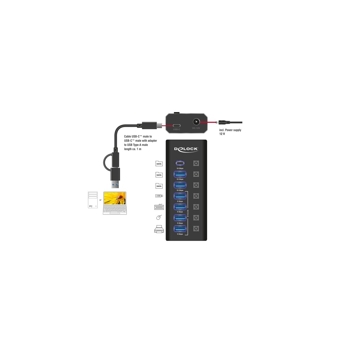 Due to the specially designed adapter, the Delock hub can be quickly and easily connected to the USB Type-A socket. Thus, it can be easily connected to new devices with USB Type-C™ female and older devices that only have a USB Type-A connector. The adapter is located directly on the cable and therefore it cannot be lost.