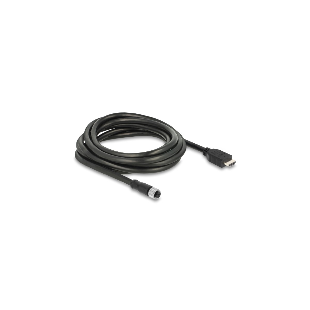This M12 connection cable by Delock is specially designed for industrial applications where HDMI signals must be transmitted reliably and safely, e.g. in image processing systems, industrial cameras, displays, mobile machines or industrial PCs with HDMI output in machines.
