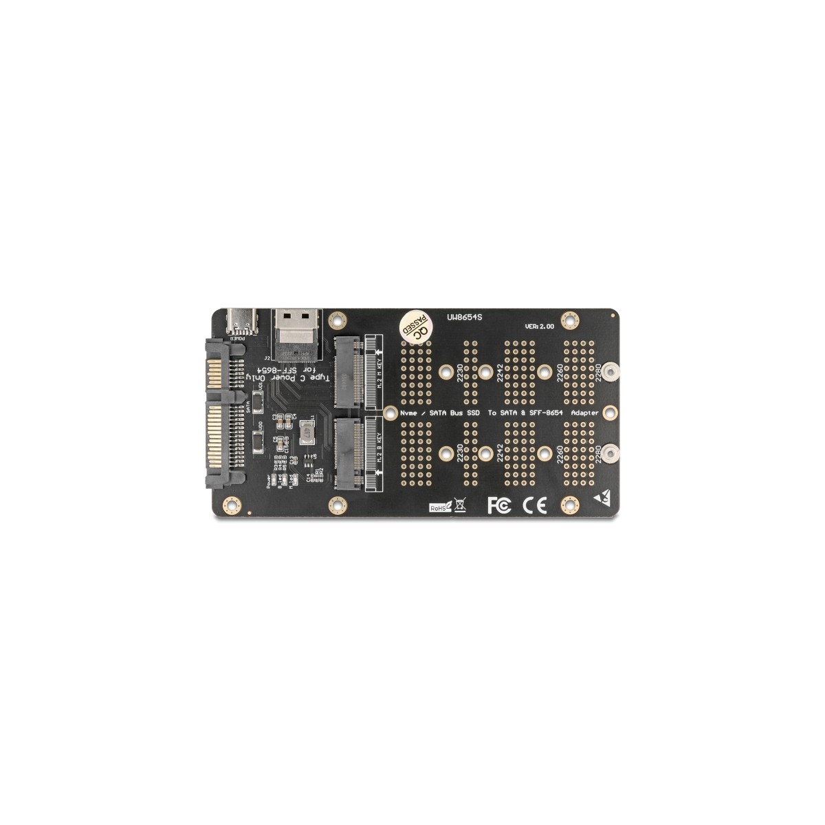 This Delock converter enables the connection of a M.2 SSD in 2280, 2260, 2242 and 2230 format with key B and a M.2 SSD in 2280, 2260, 2242 and 2230 format with key M. It allows the possibility to connect a M.2 SSD based on PCIe and M.2 SSD based on SATA at the same time. The converter connects via the SATA interface for SATA M.2 SSDs and via the SFF-8654 interface for PCIe M.2 SSDs, depending on the type of SSD used.