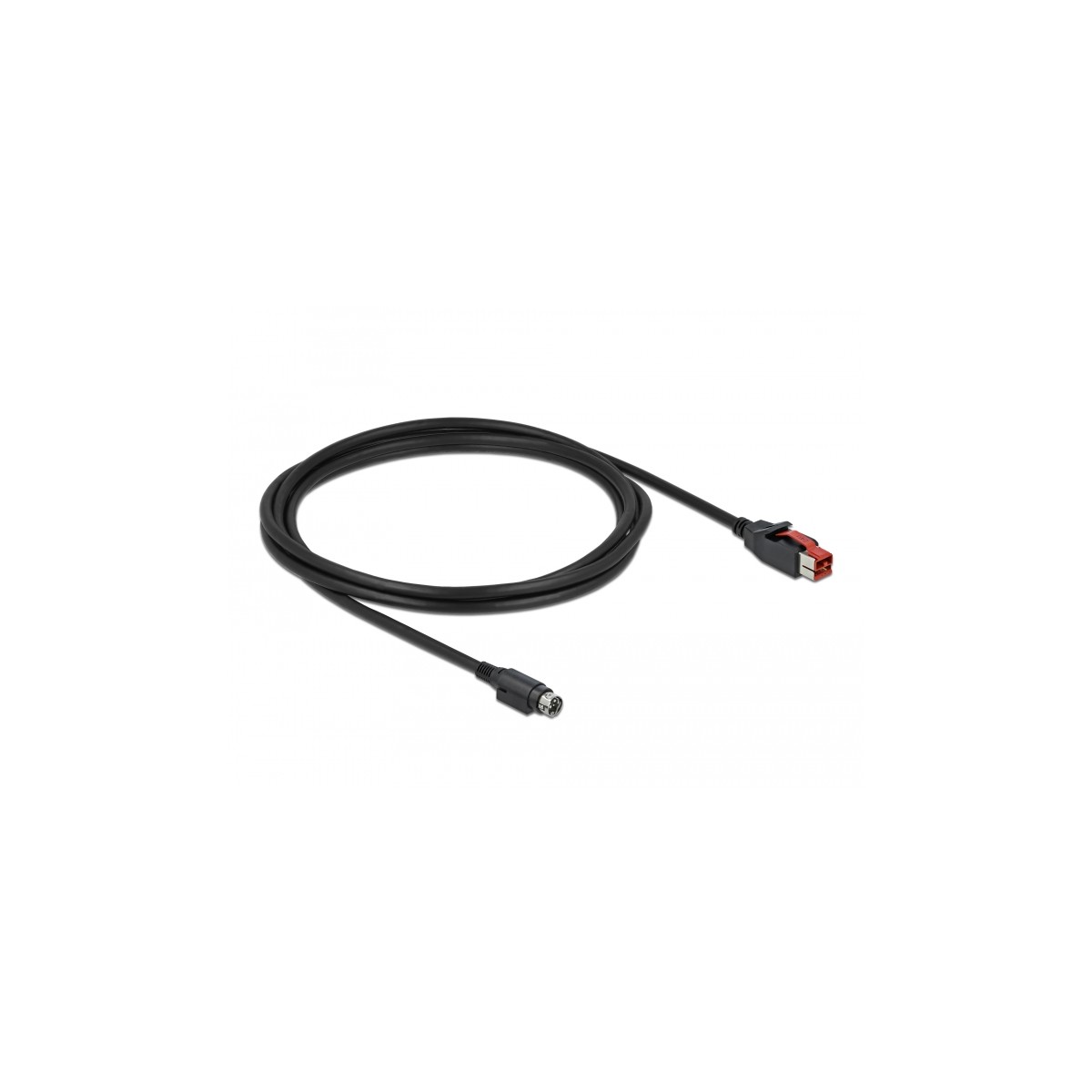 This PoweredUSB cable by Delock can be used to supply power to a device with Mini-DIN female port via a PC or hub with PoweredUSB 24 V port.