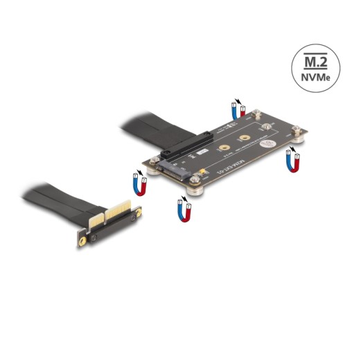 This M.2 to PCIe x4 adapter by Delock enables it to use an M.2 module in a PCIe x4 slot. Due to the integrated cable, the M.2 module can be mounted in an easily accessible place.
