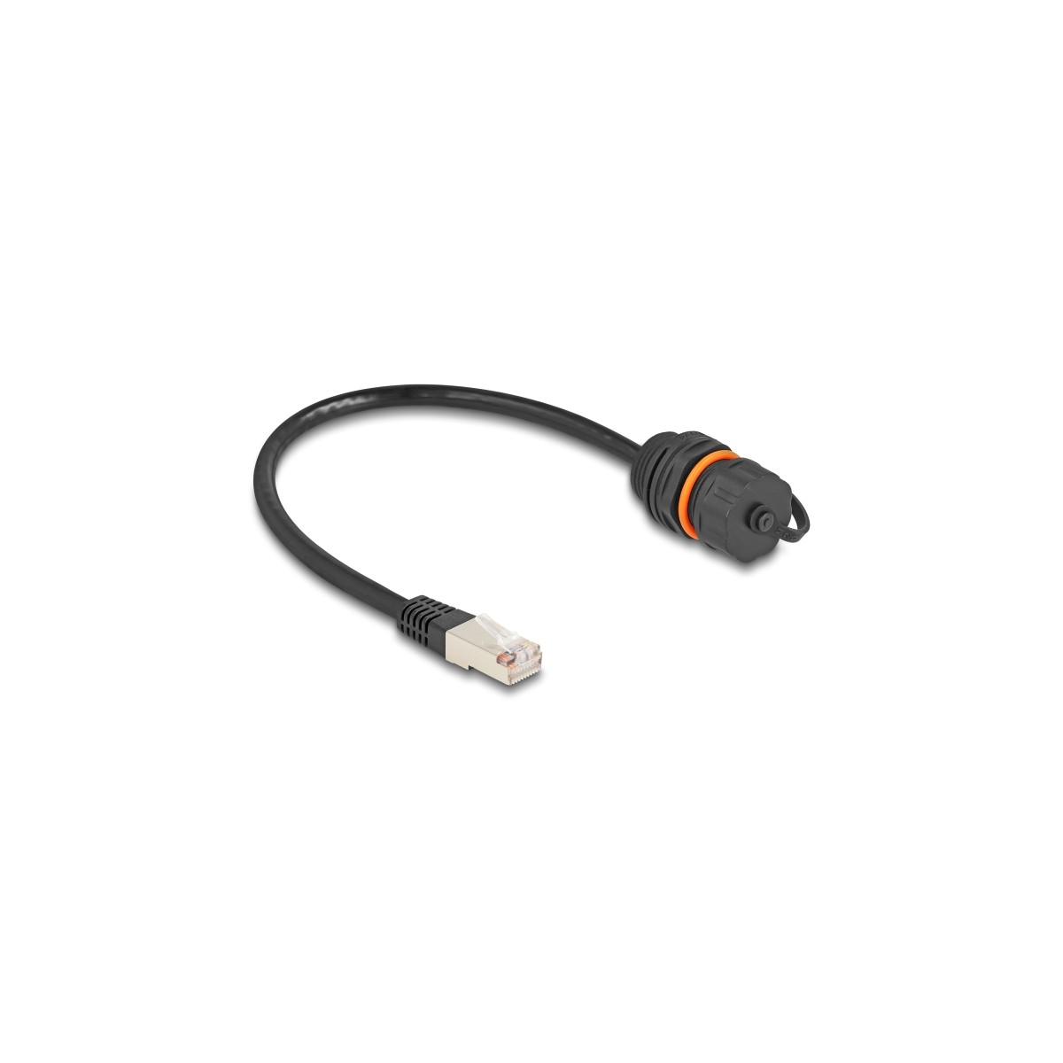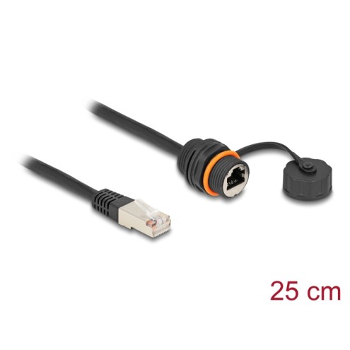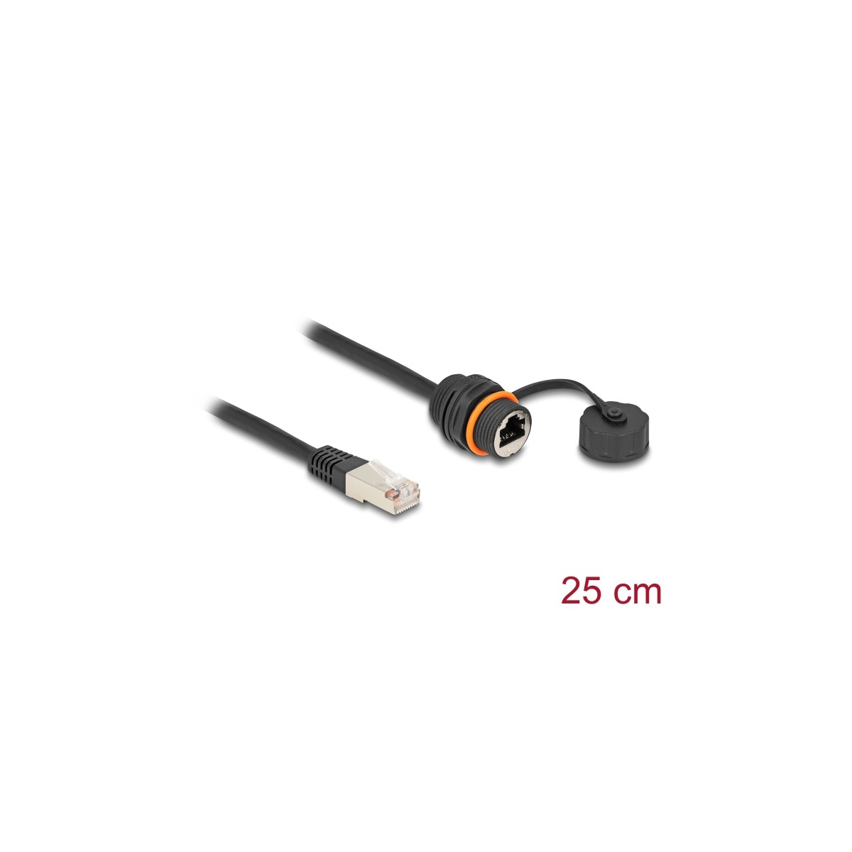 Delock Cable RJ45 plug to RJ45 jack Cat.6A for built-in with M20 thread and protective cap IP68 dust and waterproof 25 cm black