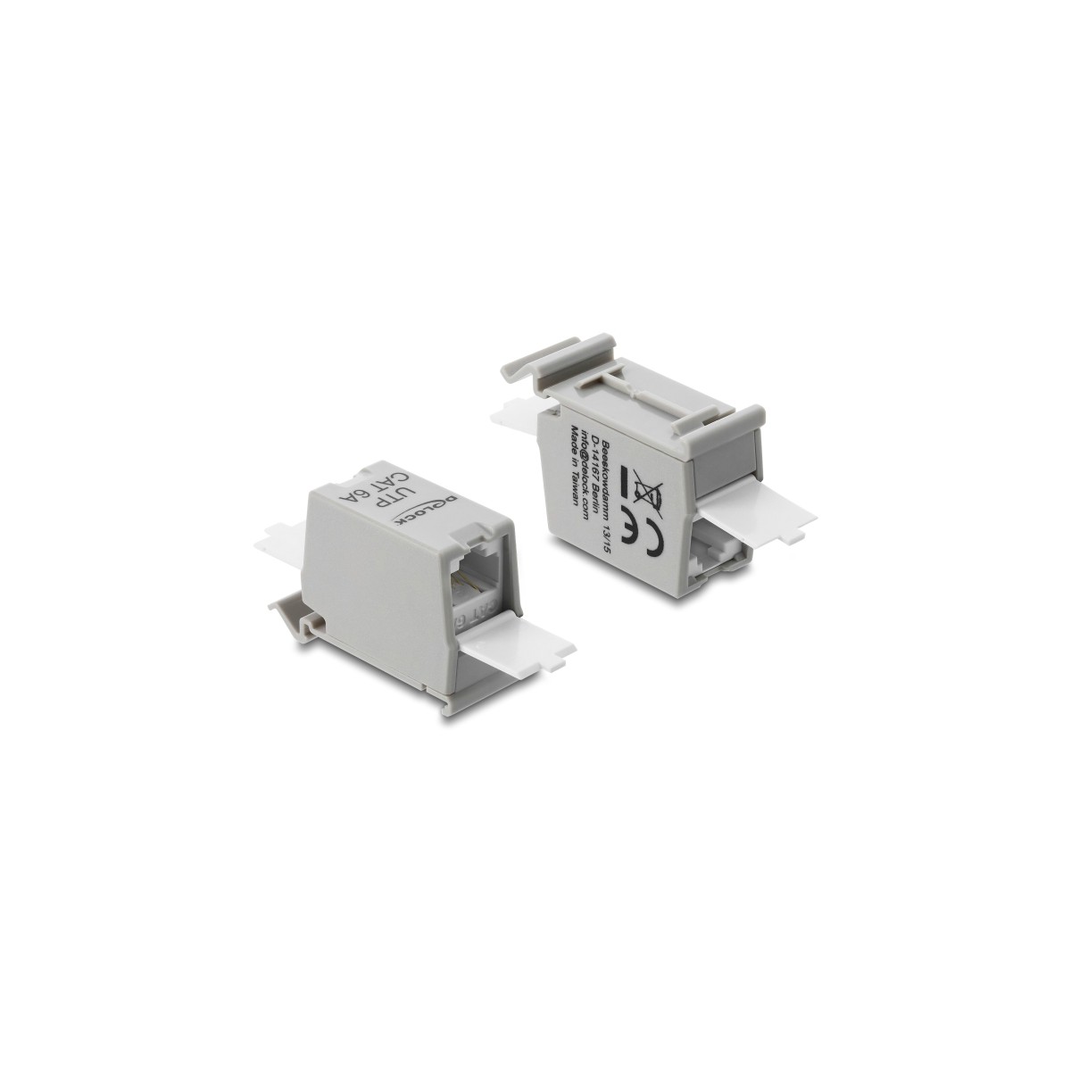 Delock RJ45 Coupler Cat.6A jack to jack with dust protection cap for DIN rail mounting, unshielded grey / white