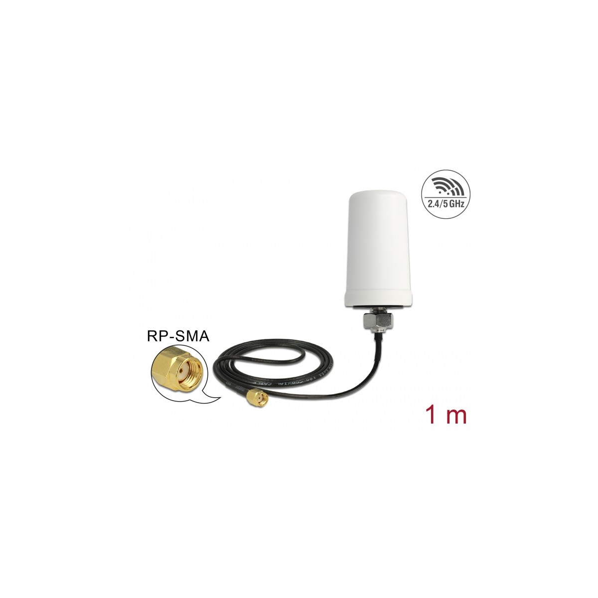 Delock WLAN 802.11 ac/a/h/b/g/n Antenna RP-SMA plug 1.4 - 3 dBi omnidirectional with connection cable (ULA 100, 1 m) white outdo