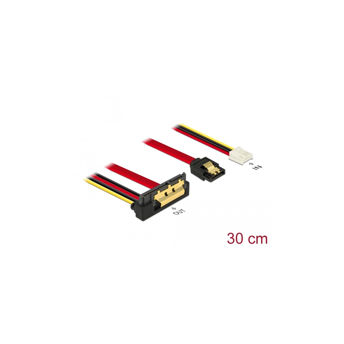 Delock Cable SATA 6 Gb/s 7 pin receptacle + Floppy 4 pin power female > SATA 22 pin receptacle downwards angled metal 30 cm