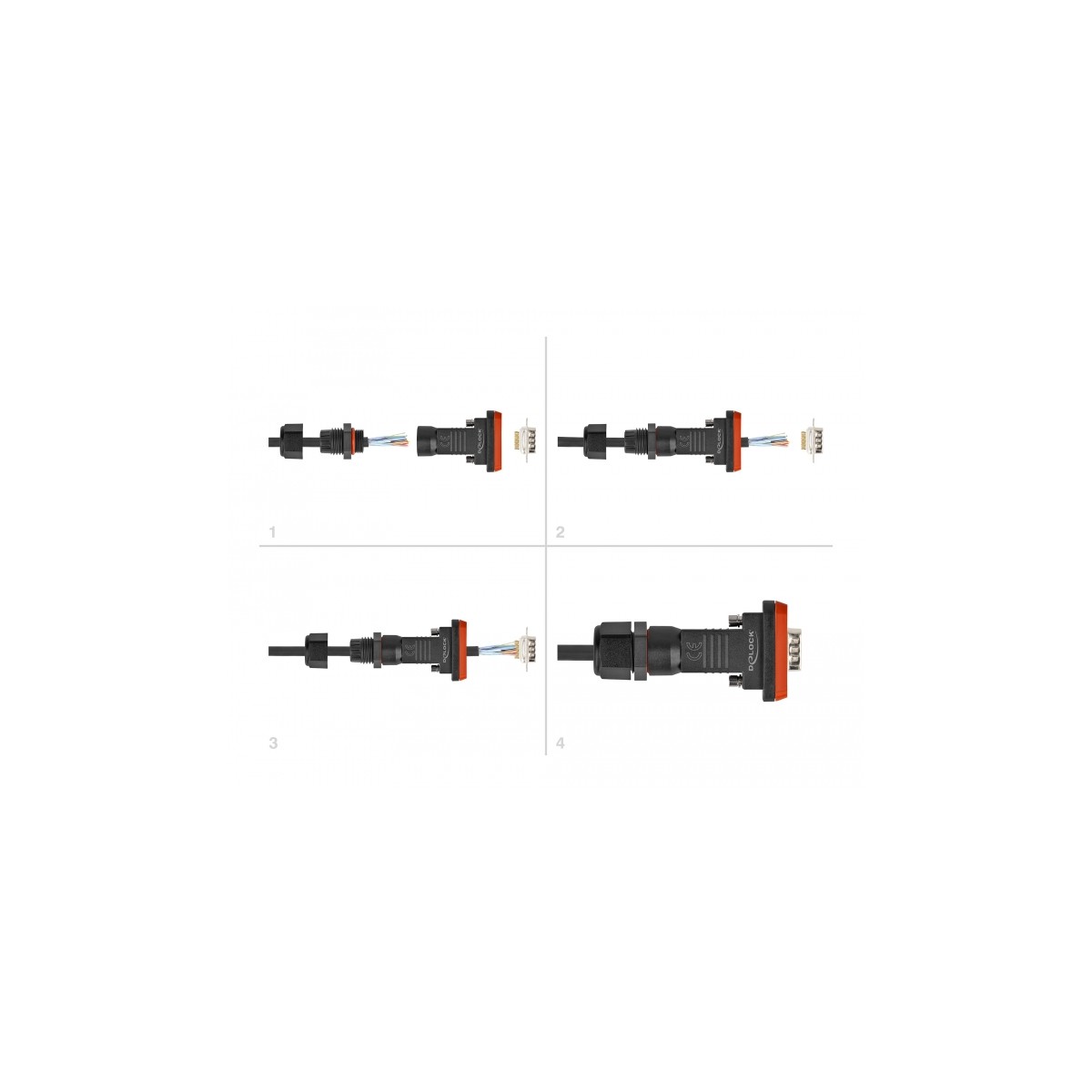 This D-Sub female connector by Delock is suitable for solder assembly and can be used for cable assembly. The IP67 waterproof housing protects the cable wires from moisture and is ideal for use in switch cabinets.