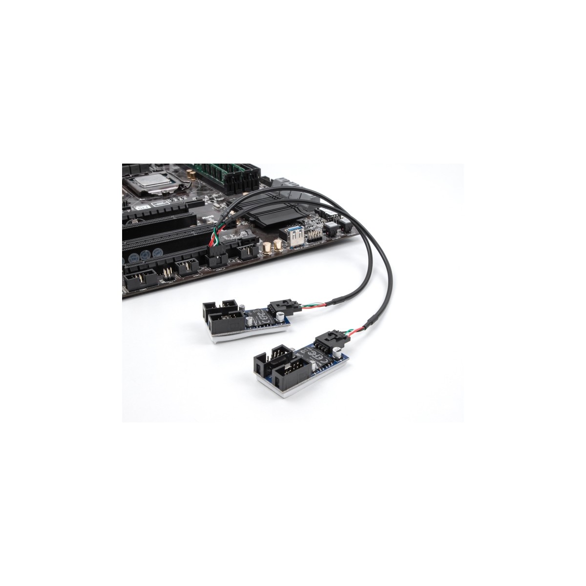 This cable allows the connection between devices or modules equipped with a USB pin header and a motherboard. The cable can be used e.g. to connect two pin header hubs to one pin header connector on the motherboard.