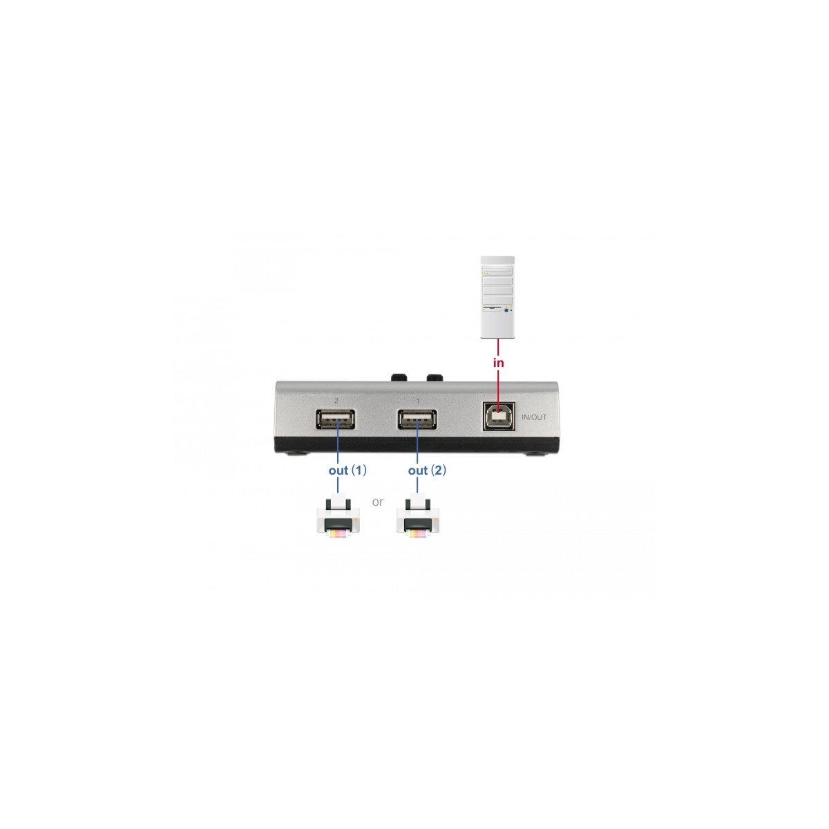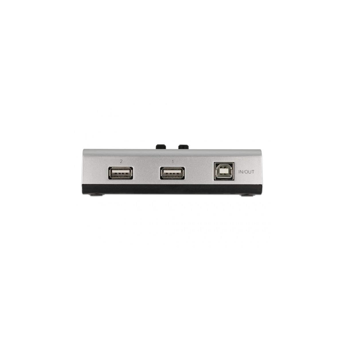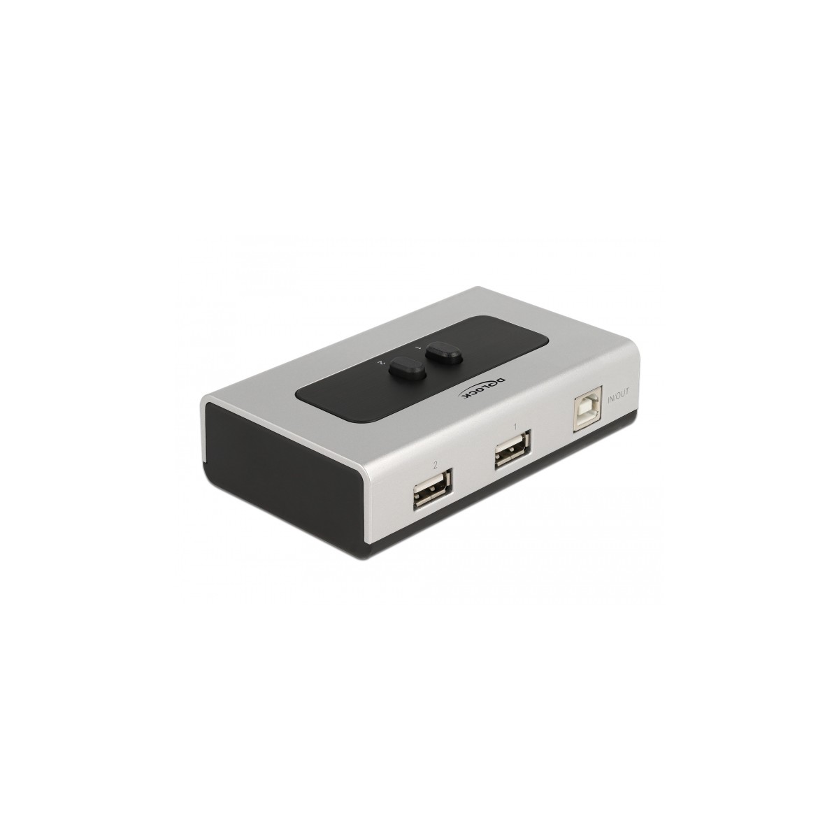 This bidirectional USB 2.0 switch by Delock allows one computer the possibility to share two USB peripheral. With the two buttons on the switch allows the computer to establish a USB connection to the desired peripheral device. Printers, card readers, hard drives etc. can be specifically activated and made available to various applications.