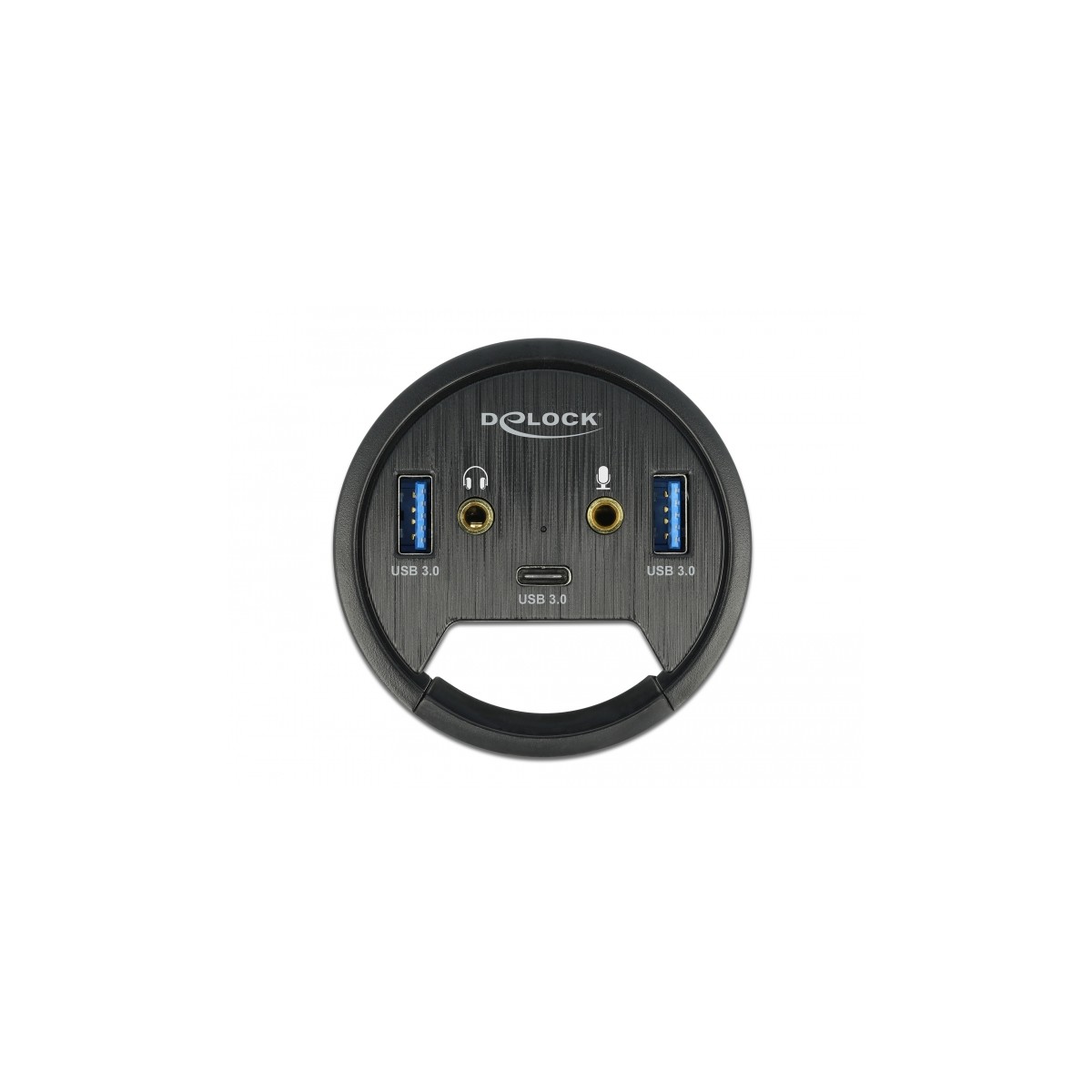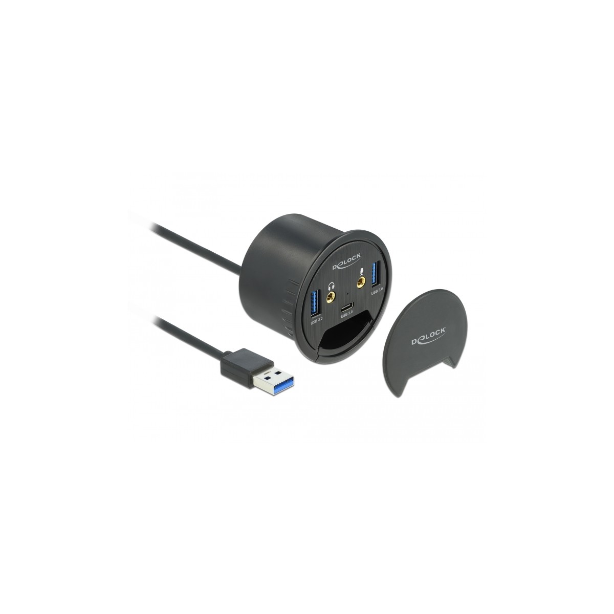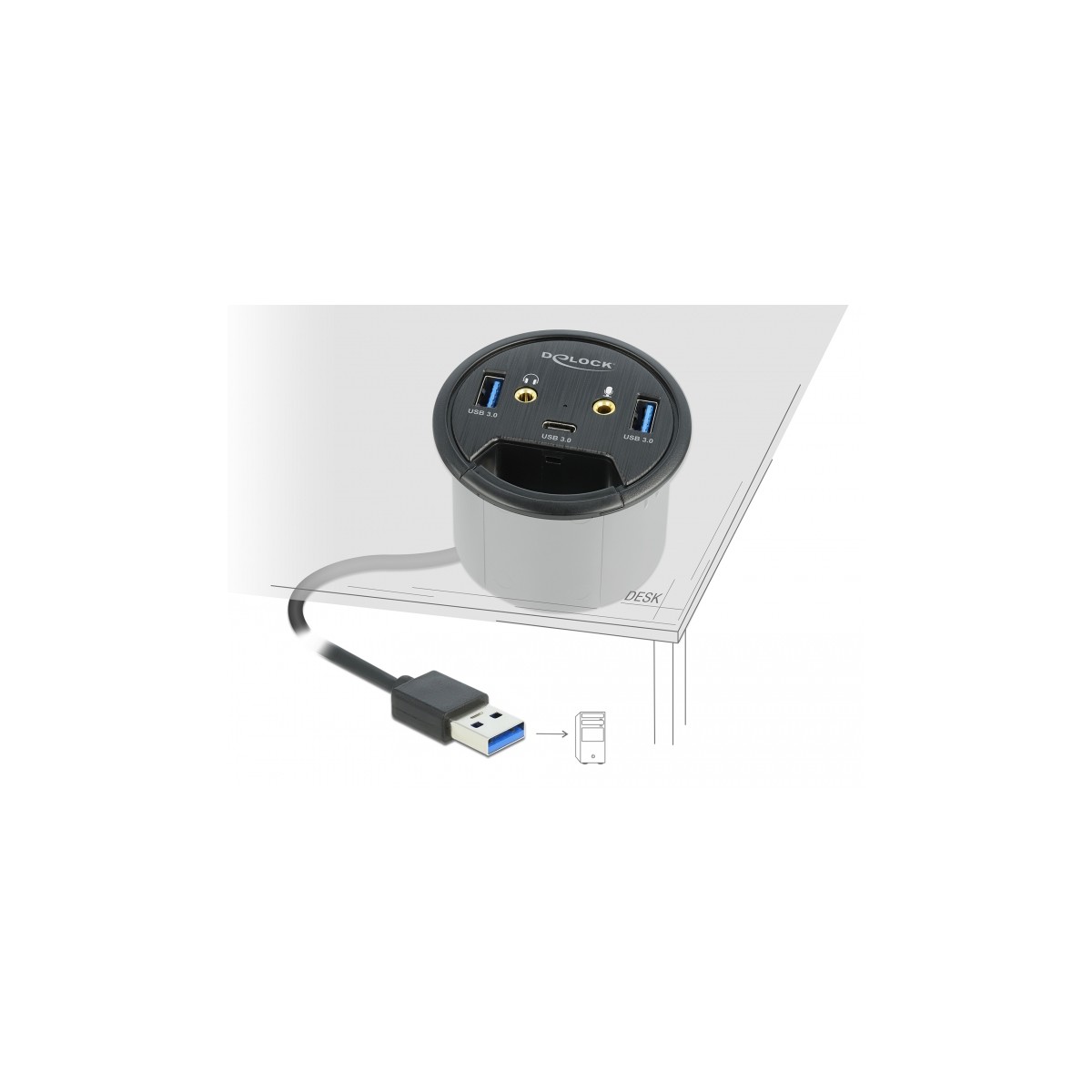 This hub by Delock can be installed into an existing cut-out of the desk with a diameter of 60 mm and can be connected to a computer via the USB Type-A interface. It expands the computer by two USB Type-A ports and one USB Type-C™ port.
