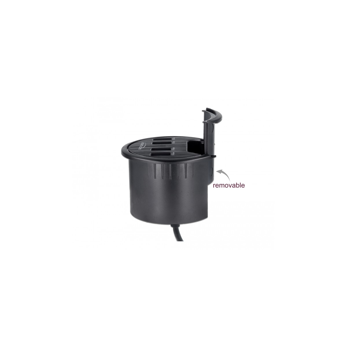 This hub by Delock can be installed into an existing cut-out of the desk with a diameter of 60 mm and can be connected to a computer via the USB Type-A interface. It expands the computer by four USB Type-A connectors.