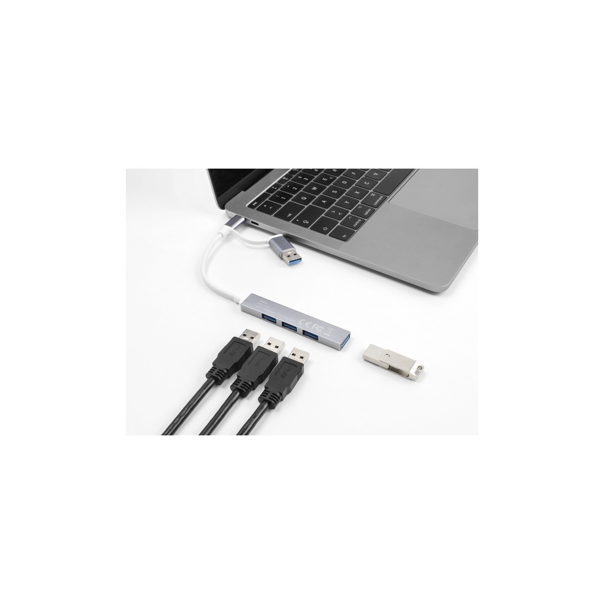 Due to the specially designed adapter, the Delock hub can be quickly and easily connected to the USB Type-A socket. Thus, it can be easily connected to new devices with USB Type-C™ female and older devices that only have a USB Type-A connector. The adapter is located directly on the cable and therefore it cannot be lost.