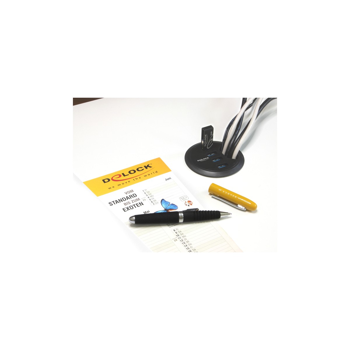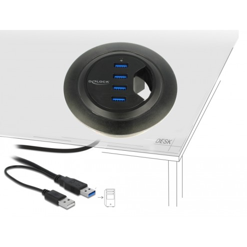 This hub by Delock can be installed into an existing cut-out of the desk with a diameter of 60 mm or 80 mm to lead through the cables for the monitor, keyboard and mouse. At the same time, the hub offers four USB Type-A female ports. The data transfer and power supply is guaranteed through one USB 3.0 Type-A male and one USB 2.0 Type-A male. The distance between the free connectors can be maximum 20 cm, because the two cables are connected with each other.