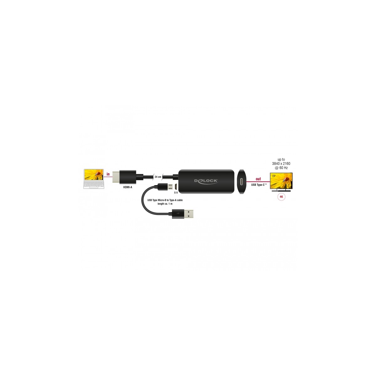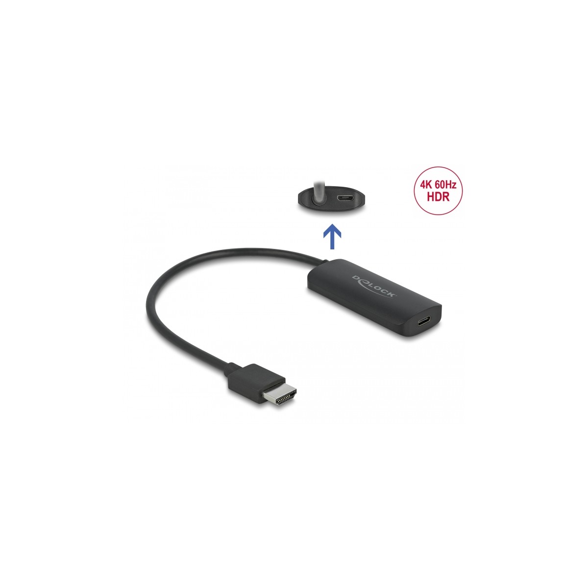 This adapter by Delock enables the connection of a USB Type-C™ (DisplayPort Alternate Mode) monitor to a free HDMI interface of a PC or laptop. The adapter will be connected to the HDMI connector of the PC or laptop and connected with an existing USB-C™ cable.
