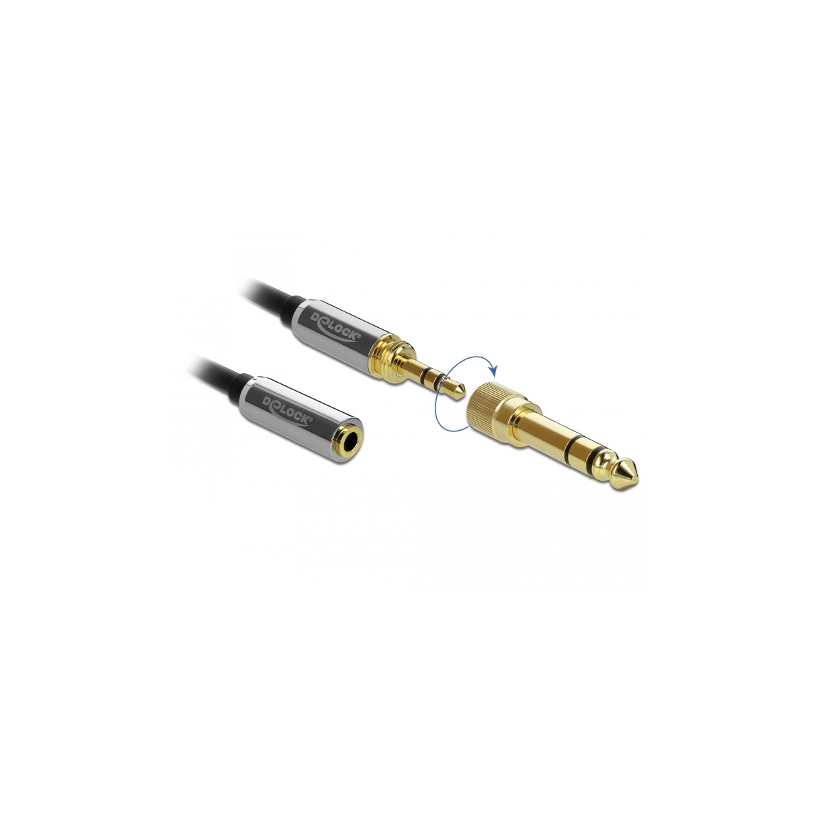 This stereo jack cable by Delock enables the extension of a 3.5 mm or 6.35 mm stereo jack connection. The included stereo jack adapter can be screwed onto the 3.5 mm stereo jack male connector and supports a stable connection. Thus this cable can be also used for connections of audio devices with 6.35 mm interface.