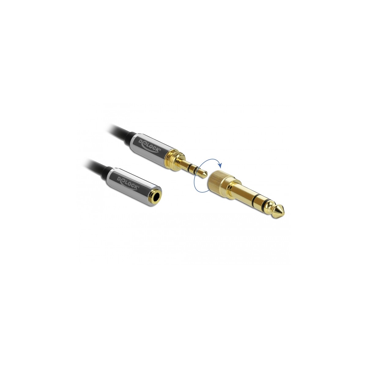 This stereo jack cable by Delock enables the extension of a 3.5 mm or 6.35 mm stereo jack connection. The included stereo jack adapter can be screwed onto the 3.5 mm stereo jack male connector and supports a stable connection. Thus this cable can be also used for connections of audio devices with 6.35 mm interface.