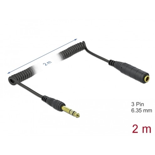 Delock Coiled Cable Extension 3 pin 6.35 mm Stereo Jack male to Stereo Jack female 2 m black
