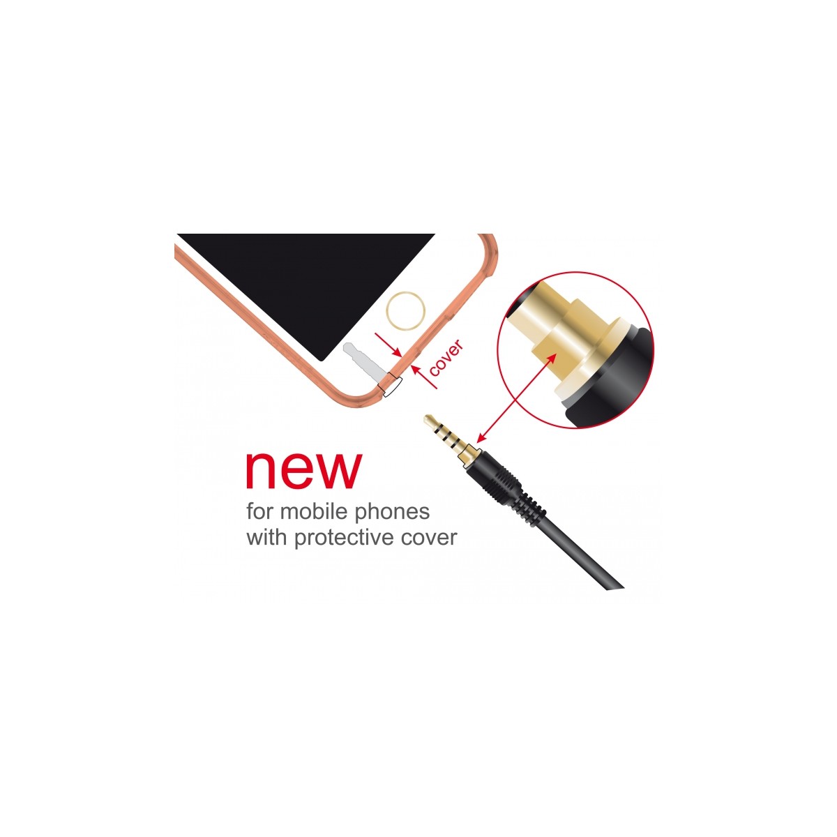 This stereo jack cable by Delock with 4 pin male connector is compatible to iPhone, iPad and iPod. It enables the connection of a mobile device to e.g. a stereo system or car radio. One of the stereo jack connectors is angled, in case the existing stereo jack female port is difficult to access. Due to the additional gold ring at the end of the connector, this audio cable can easily be connected to devices, which are protected by a cover.