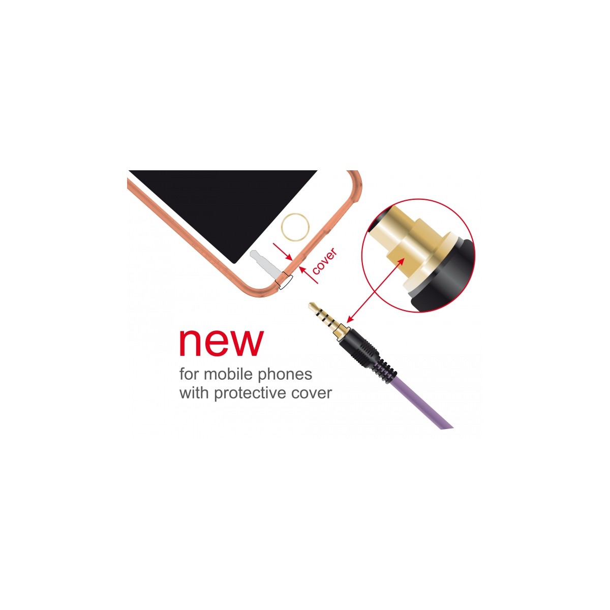 This stereo jack cable by Delock with its 4 pin connector according to CTIA standard, enables the connection of a mobile device e.g. to a home system or a car radio. Due to the additional gold ring at the end of the connector, this audio cable can easily be connected to devices, which are protected by a cover.