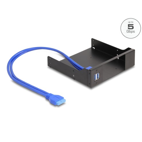 This metal installation frame by Delock can be mounted into a 5.25″ bay of a computer. It has two USB 5 Gbps ports and will be connected internally via a USB 5 Gbps pin header male on the motherboard.