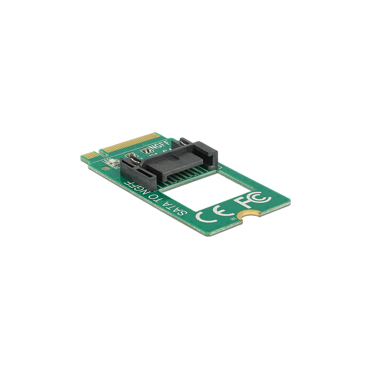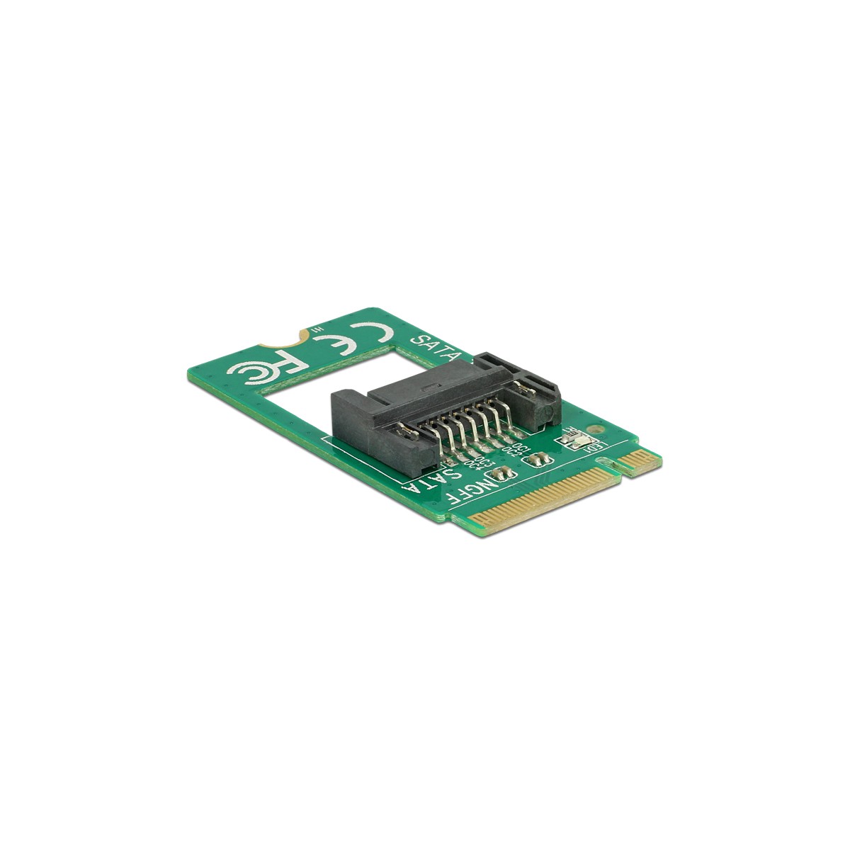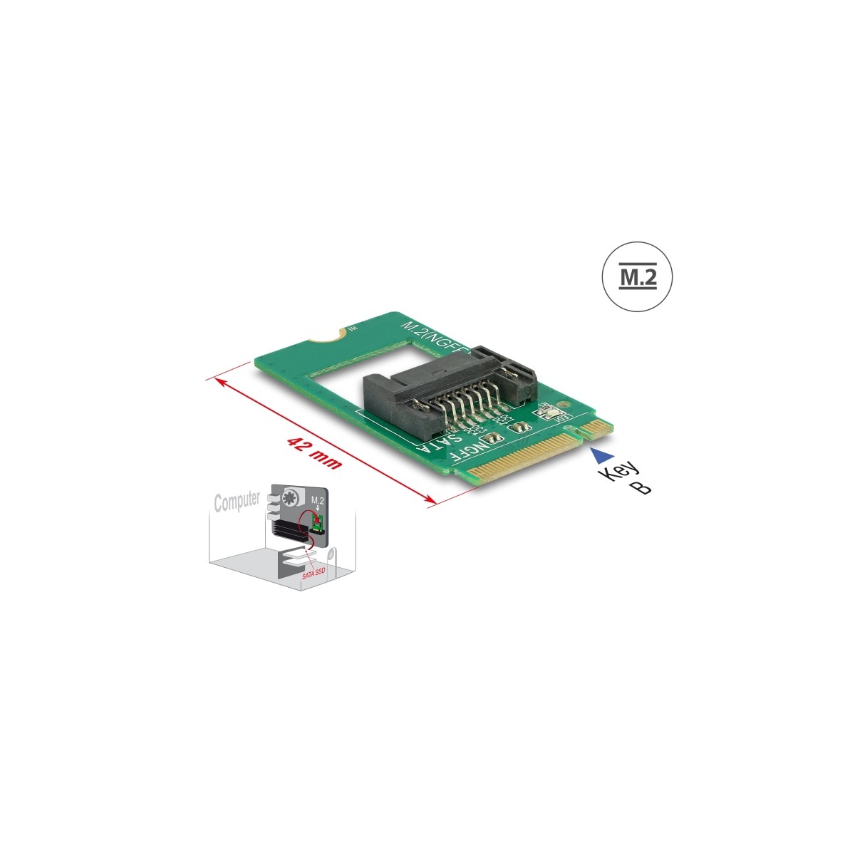 This adapter by Delock converts the M.2 interface into a SATA 7 pin interface. Thus it can be used to connect e.g. a SATA SSD to the M.2 interface.