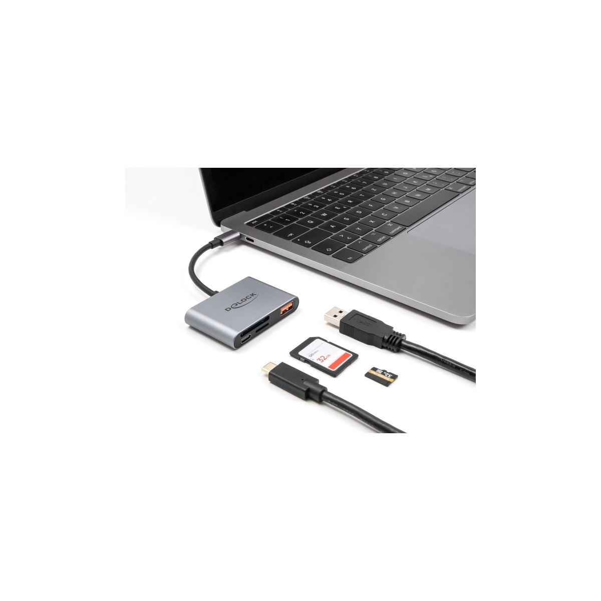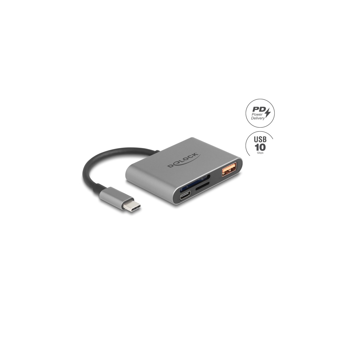 Delock USB-C™ Card Reader for SD and Micro SD memory cards + USB 10 Gbps Type-A port and USB Type-C™ PD 2.0 85 W