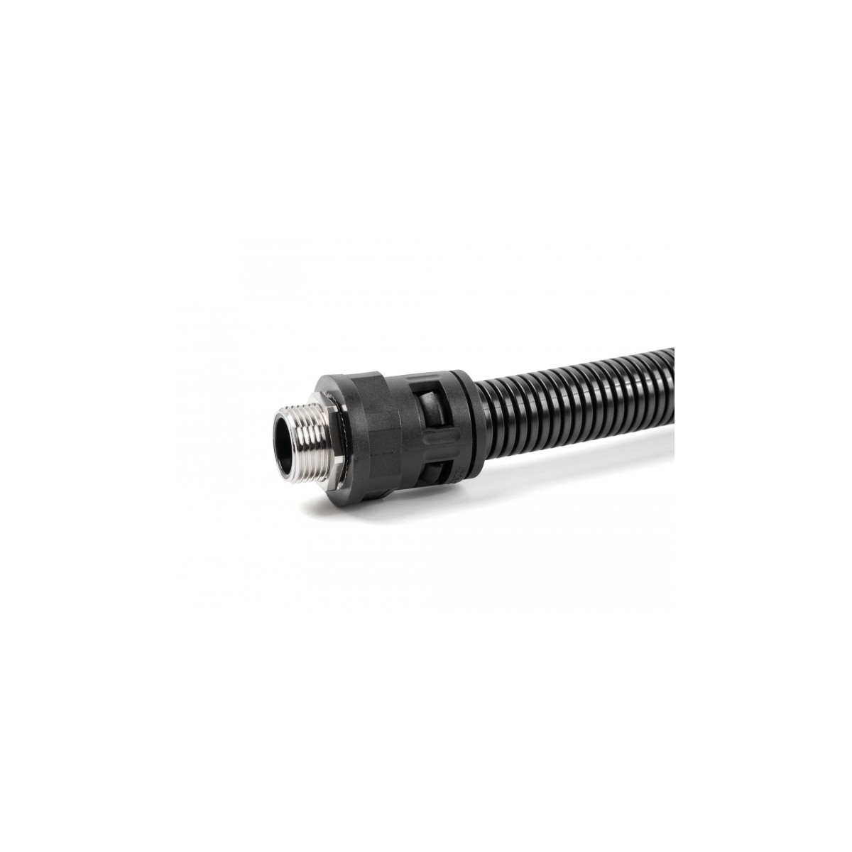 This conduit fitting by Delock can be used for easy mounting on corrugated protective conduits. The fitting has a high level of sealing, tensile strength and resilience. In combination with the Delock protective conduit 60458, it provides a secure and firm hold.