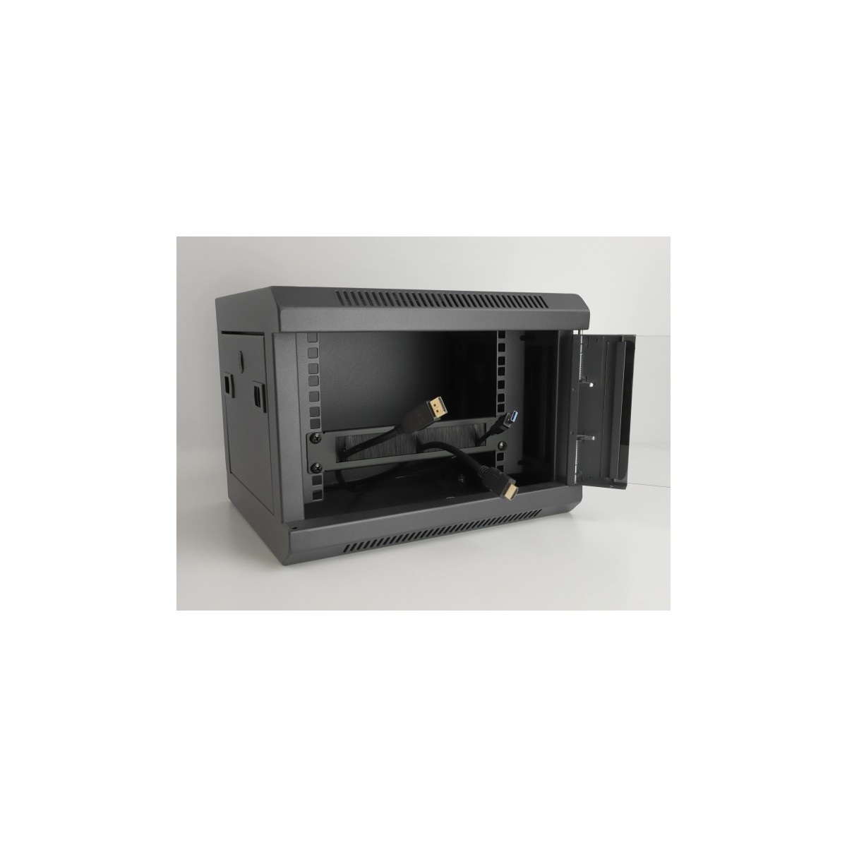 The cables are simply routed from the front to the rear, so the view of the cables inside the network cabinet is blocked and the network cabinet leaves a clean overall impression.