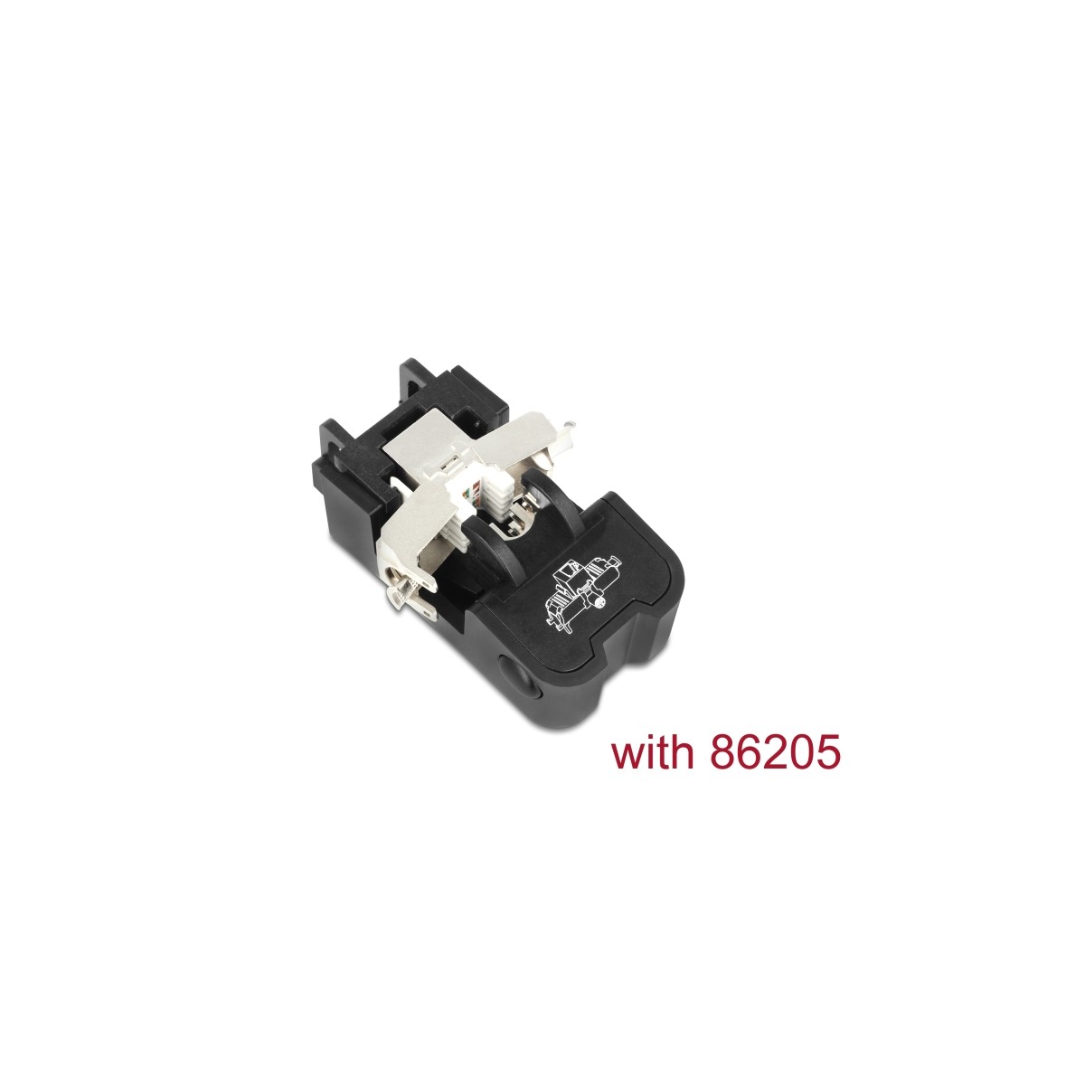 With this tool by Delock you can quickly and easily connect a network cable to the RJ45 Keystone module 86205 or 86179. The single wires need to be pre-assembled in the module, then the module is inserted in the tool and pressed. Thereby all the wires are simultaneously contacted and the excess cable ends are cut off.