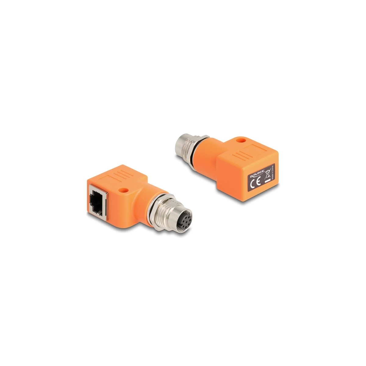 Delock M12 Adapter A-coded 8 pin female to RJ45 jack Cat.5e with mounting hole 90° angled orange