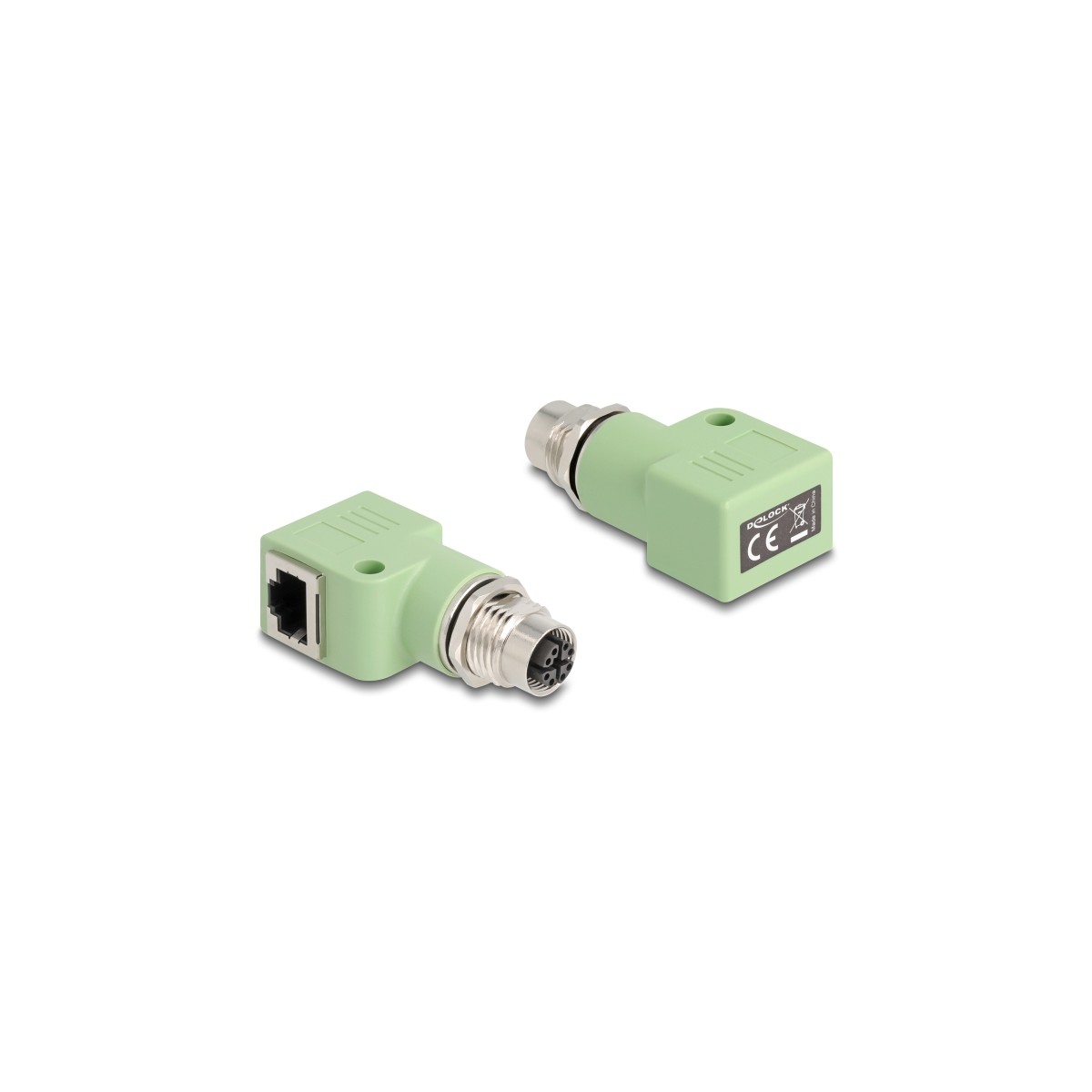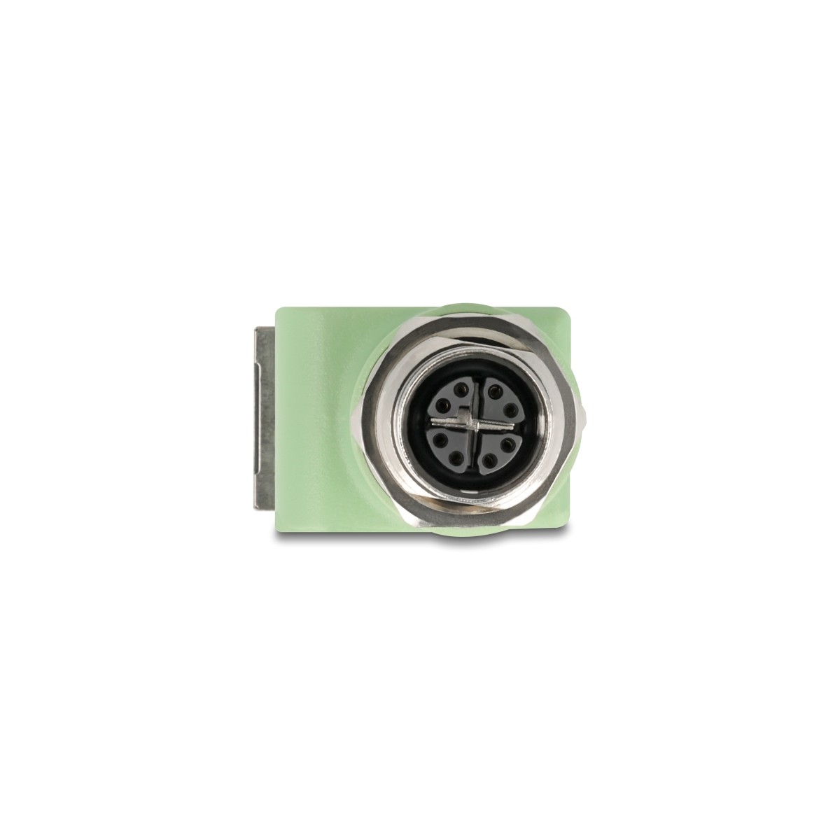 Delock M12 Adapter X-coded 8 pin female to RJ45 jack Cat.5e with mounting hole 90° angled green