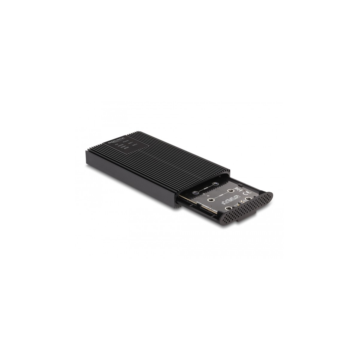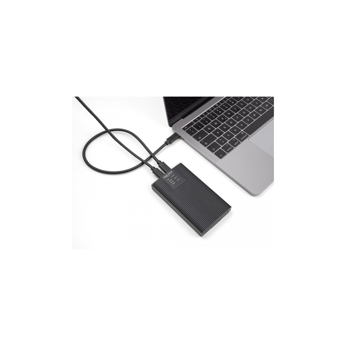 This aluminum enclosure by Delock enables the installation of two M.2 PCIe NVMe SSDs in 2280, 2260, 2242 and 2230 format. It can be connected via USB to the PC or laptop. The robust metal housing with cooling fins ensures an optimum temperature of the memory.
