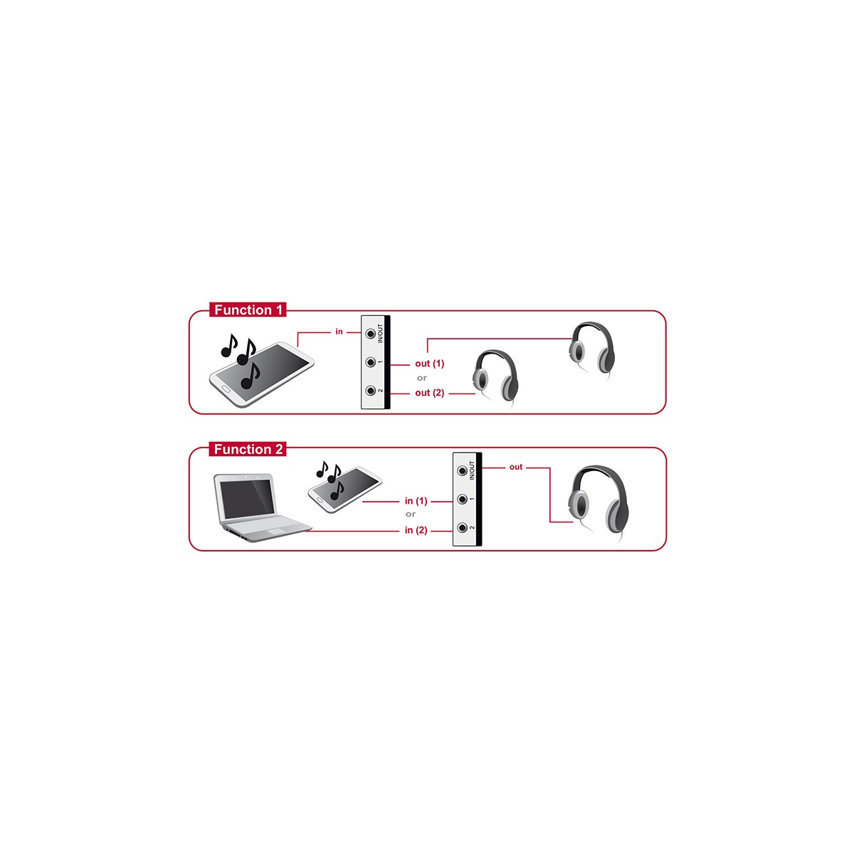 2. It can be connected to up to two devices with stereo jack port, e.g. PC, laptop or MP3 player and connect to the output port a headset. By using the button it can be selected from which device the audio signal plays on the headset.