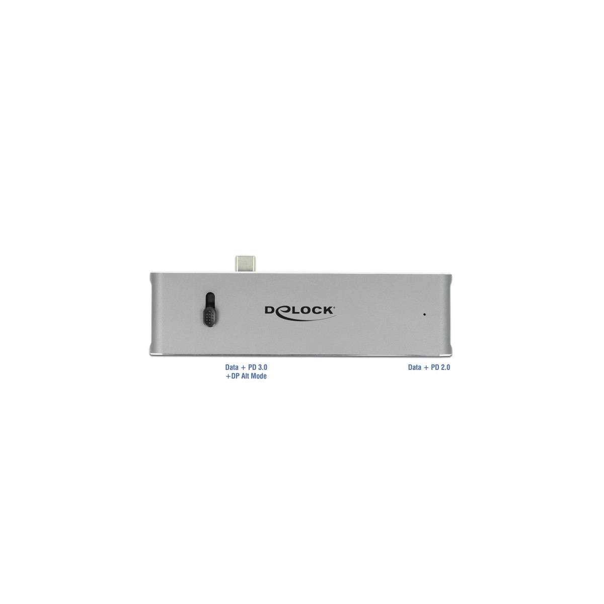 One of the two USB-C™ female ports is coupled to the insertable USB-C™ plug. This means that when it is extended (when used with a MacBook), the USB-C™ female port (pass-through) provides the full function of the USB-C™ interface. This port can transmit data at 10 Gbps, charge the device (PD 3.0), or connect another monitor with a resolution of up to 4K 60 Hz. In addition, as with MST, two additional monitors can be operated independently of each other (extended display).