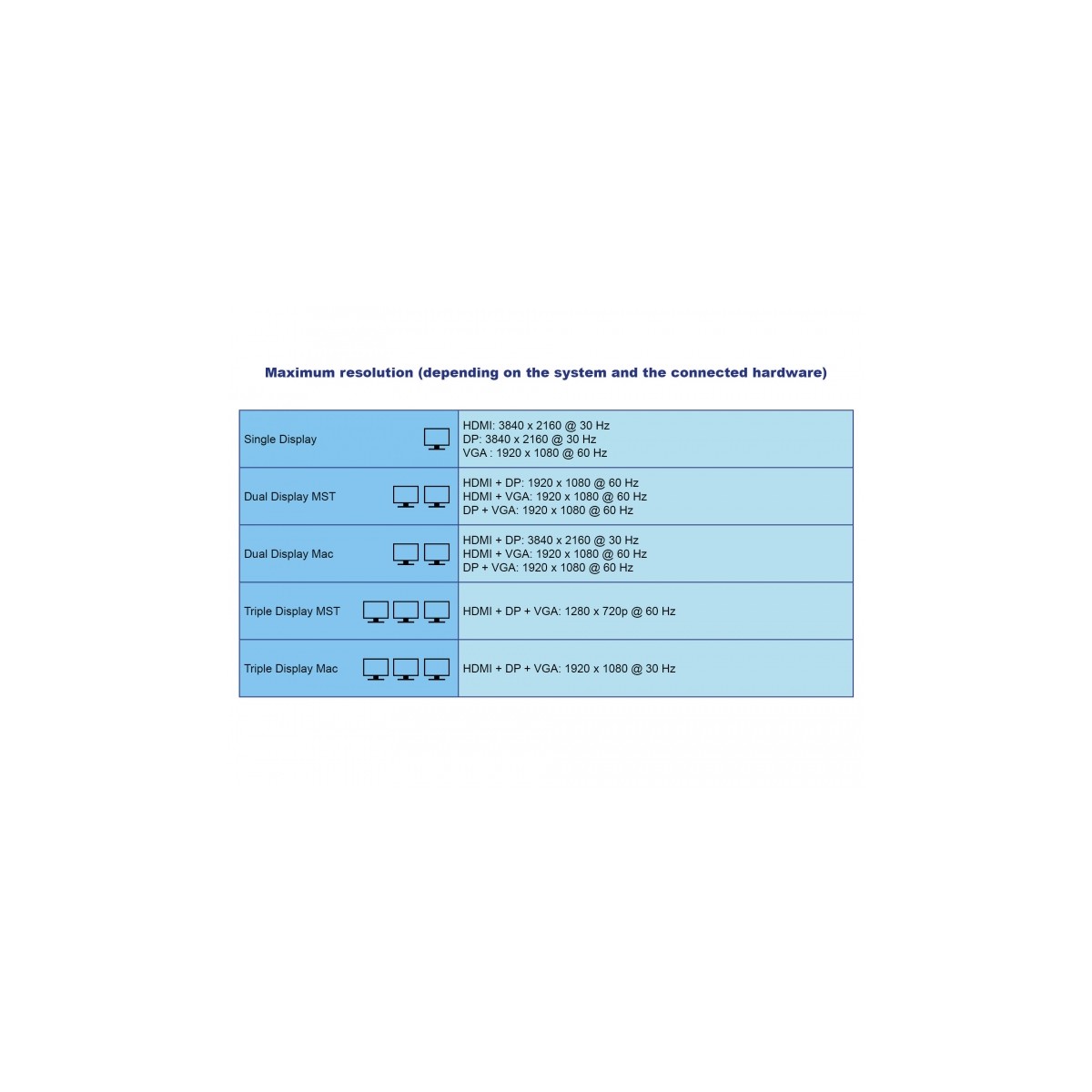| Single Display | HDMI: 3840 x 2160 @ 30 Hz DP: 3840 x 2160 @ 30 Hz VGA : 1920 x 1080 @ 60 Hz |