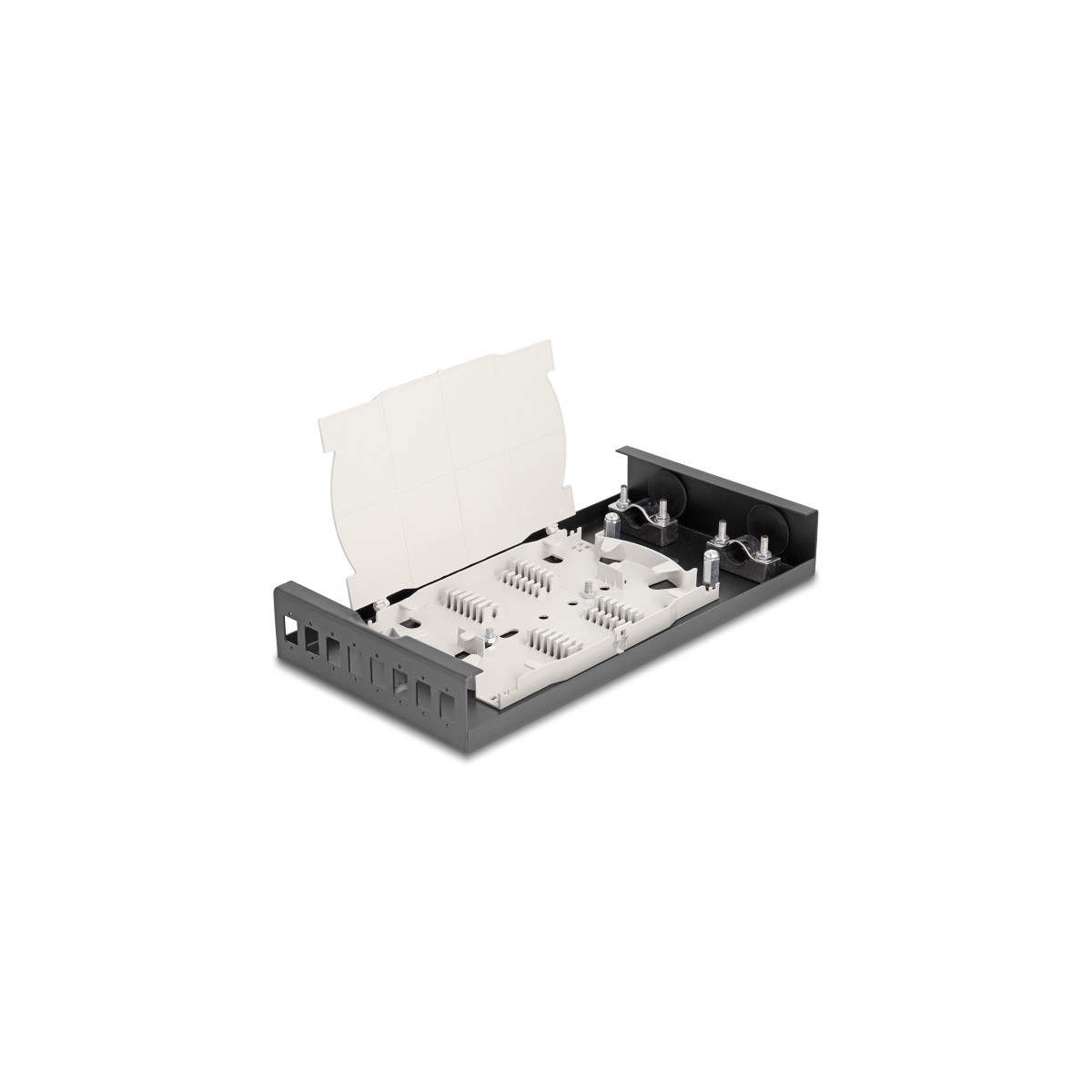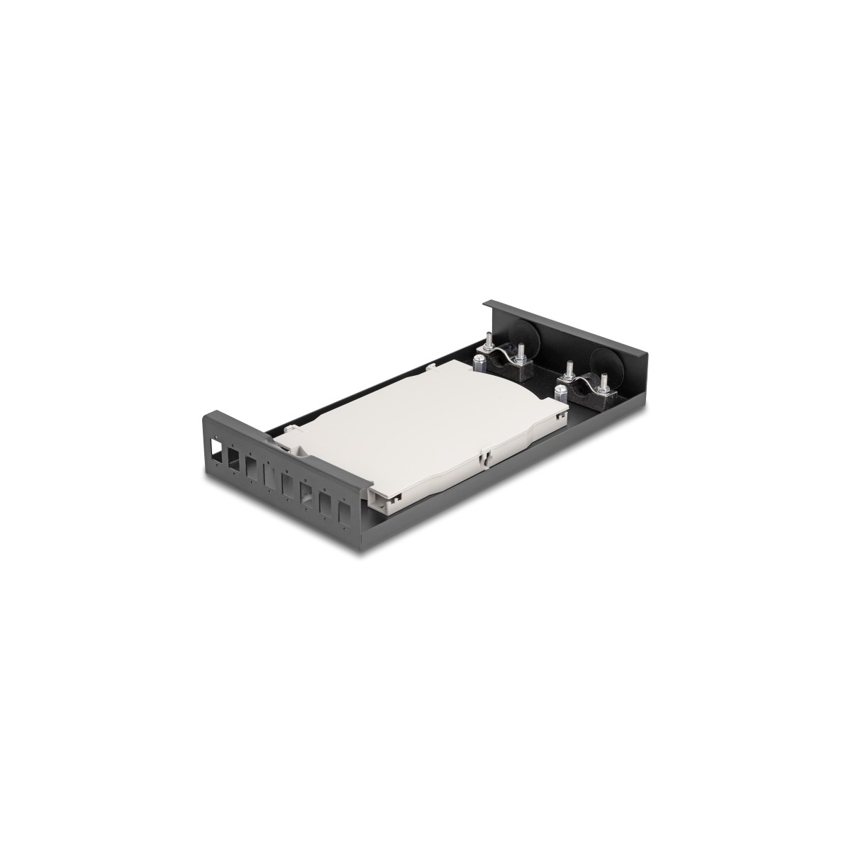 The optical fiber box by Delock can accommodate 8 SC Simplex couplers and can be used for wall mounting. On the rear side there are 2 cable entries for the feed-through of the optical fibers.