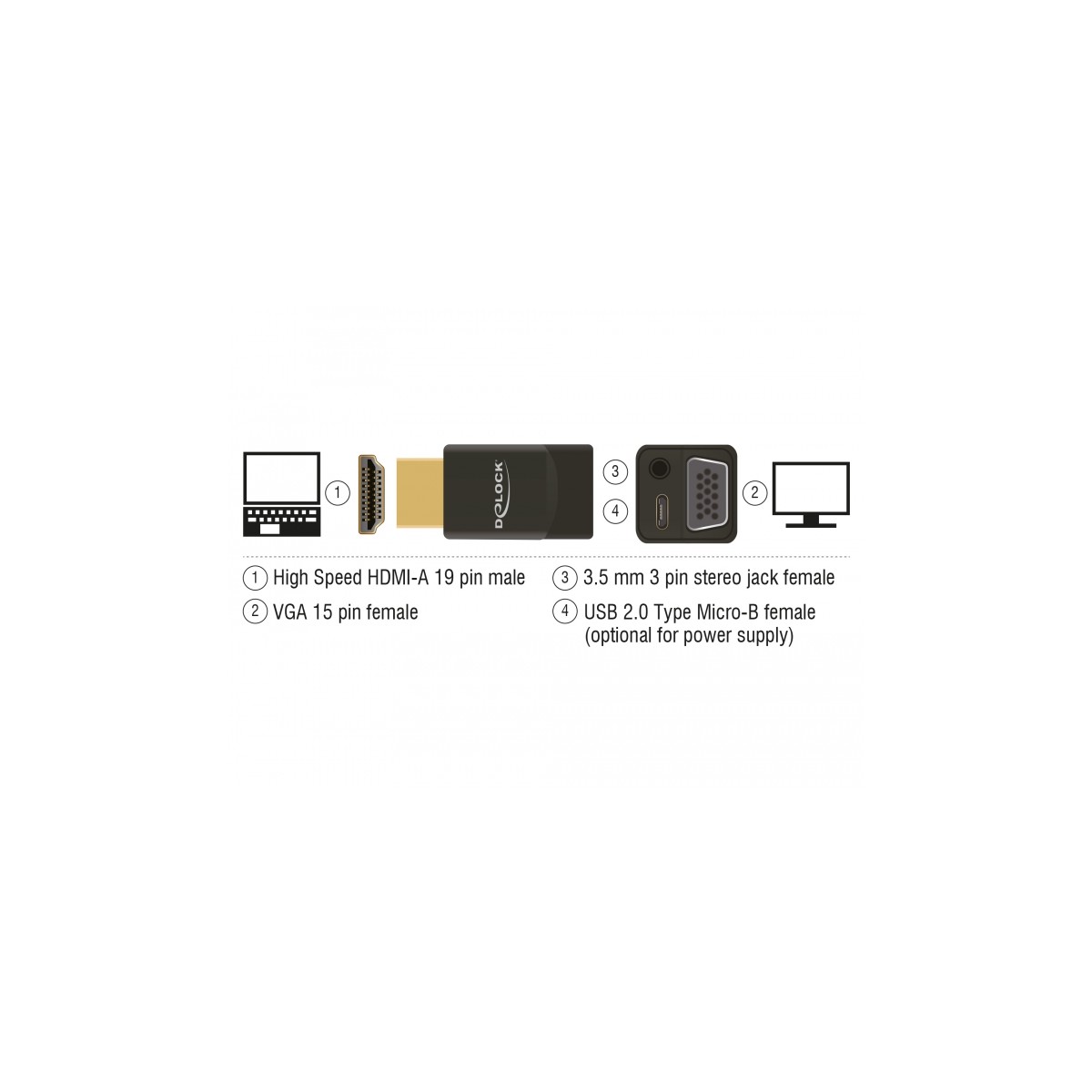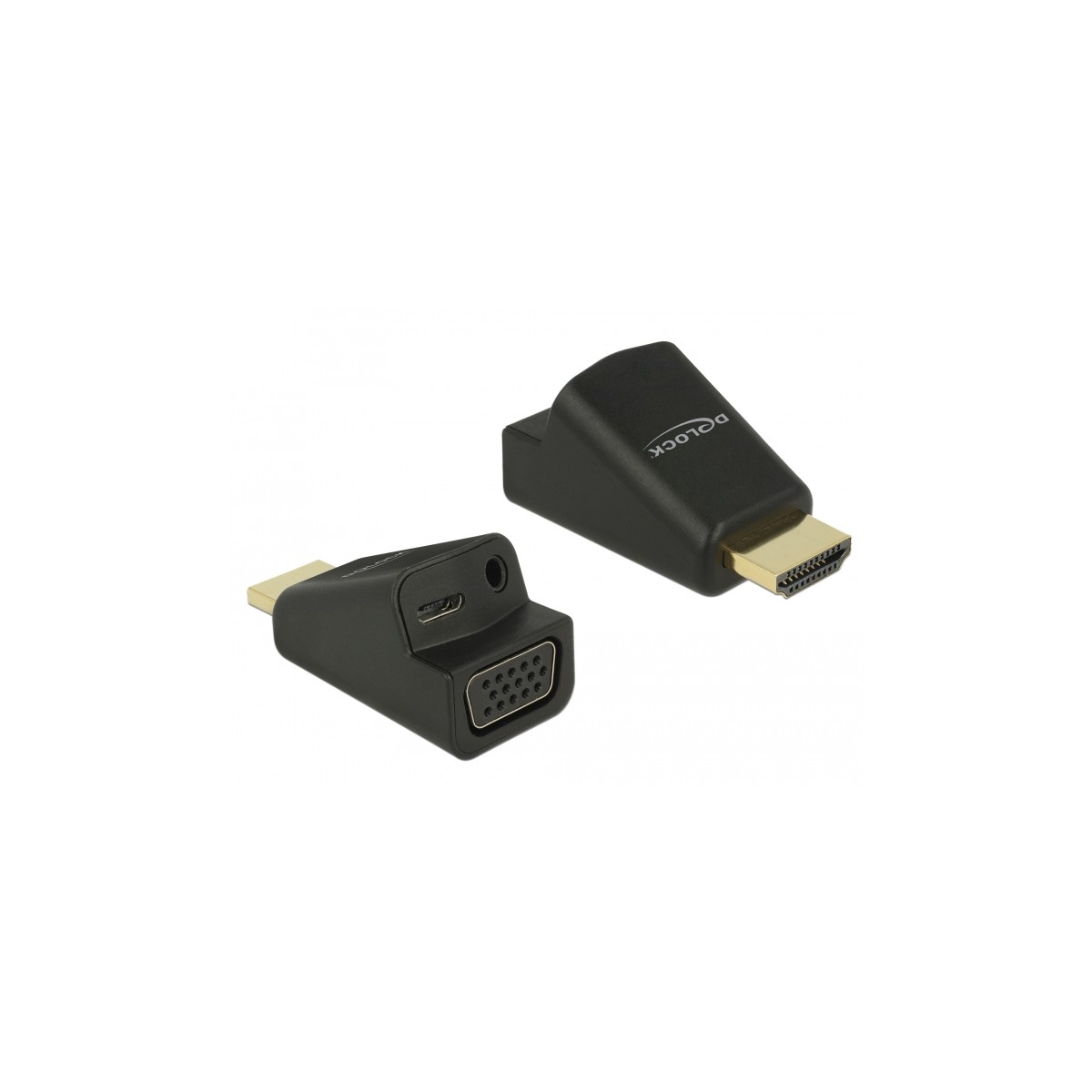 This adapter by Delock can be used to connect e.g. a VGA monitor to a free HDMI interface of the system. Furthermore, it is possible to transfer the audio signal via the Stereo jack female port.