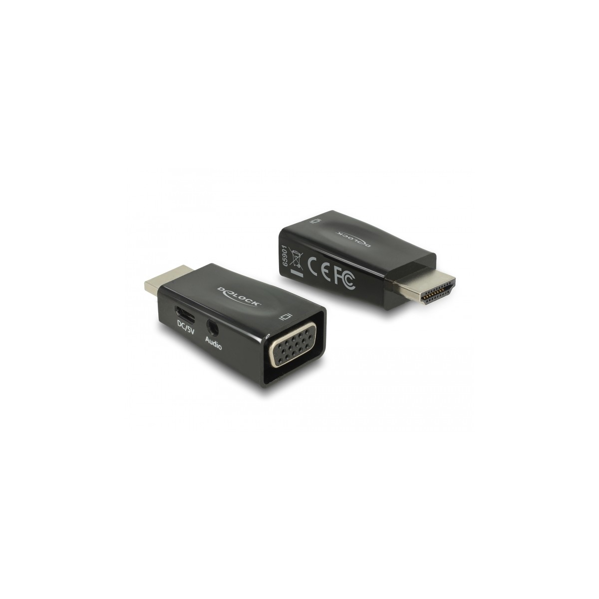This adapter by Delock can be used to connect e.g. a VGA monitor to a free HDMI interface of the system. Furthermore, it is possible to transfer the audio signal via the Stereo jack female port.